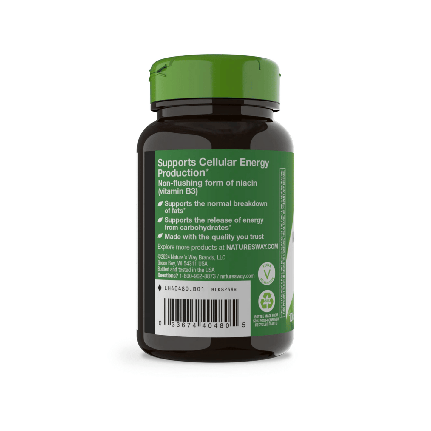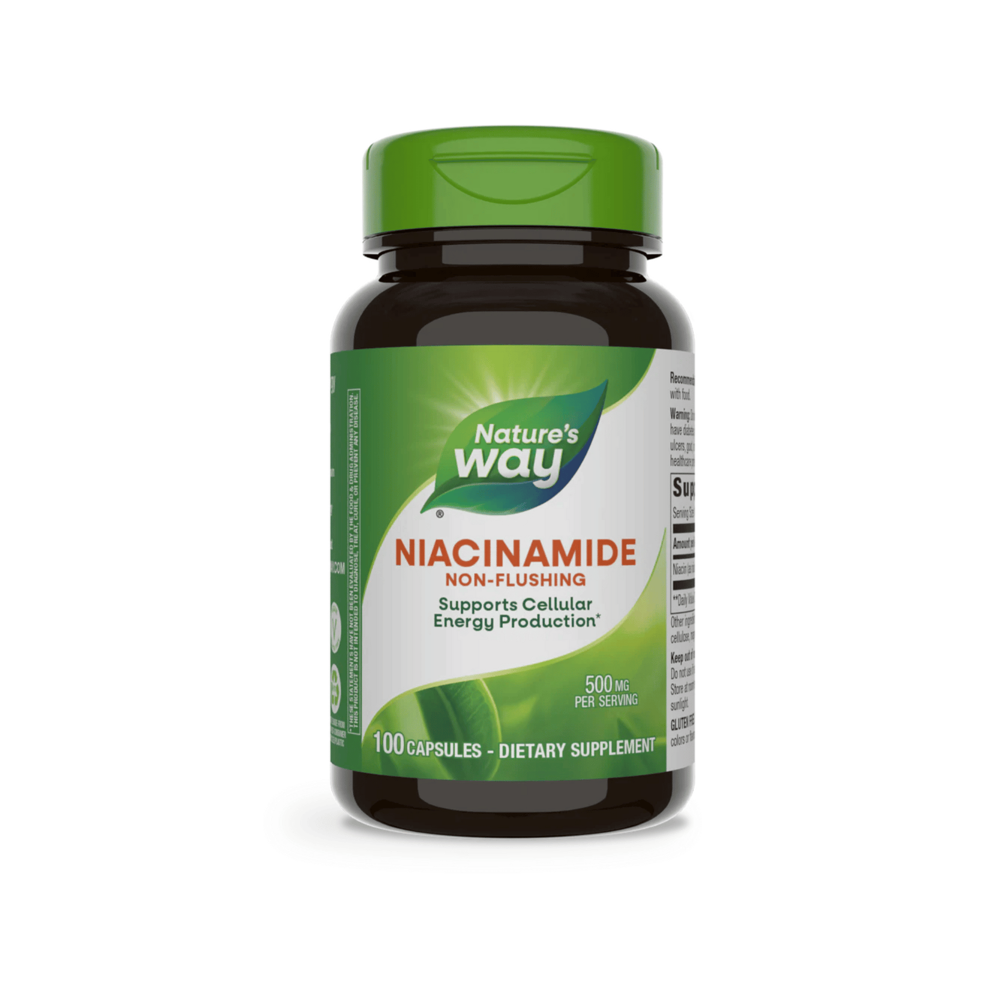 Nature’s Way Niacinamide is the non-flushing form of niacin (vitamin B3). It’s an essential vitamin necessary for the normal breakdown of fats and producing cellular energy from carbohydrates. This formula contains 500mg of niacinamide, or 3,125% of the Daily Value.