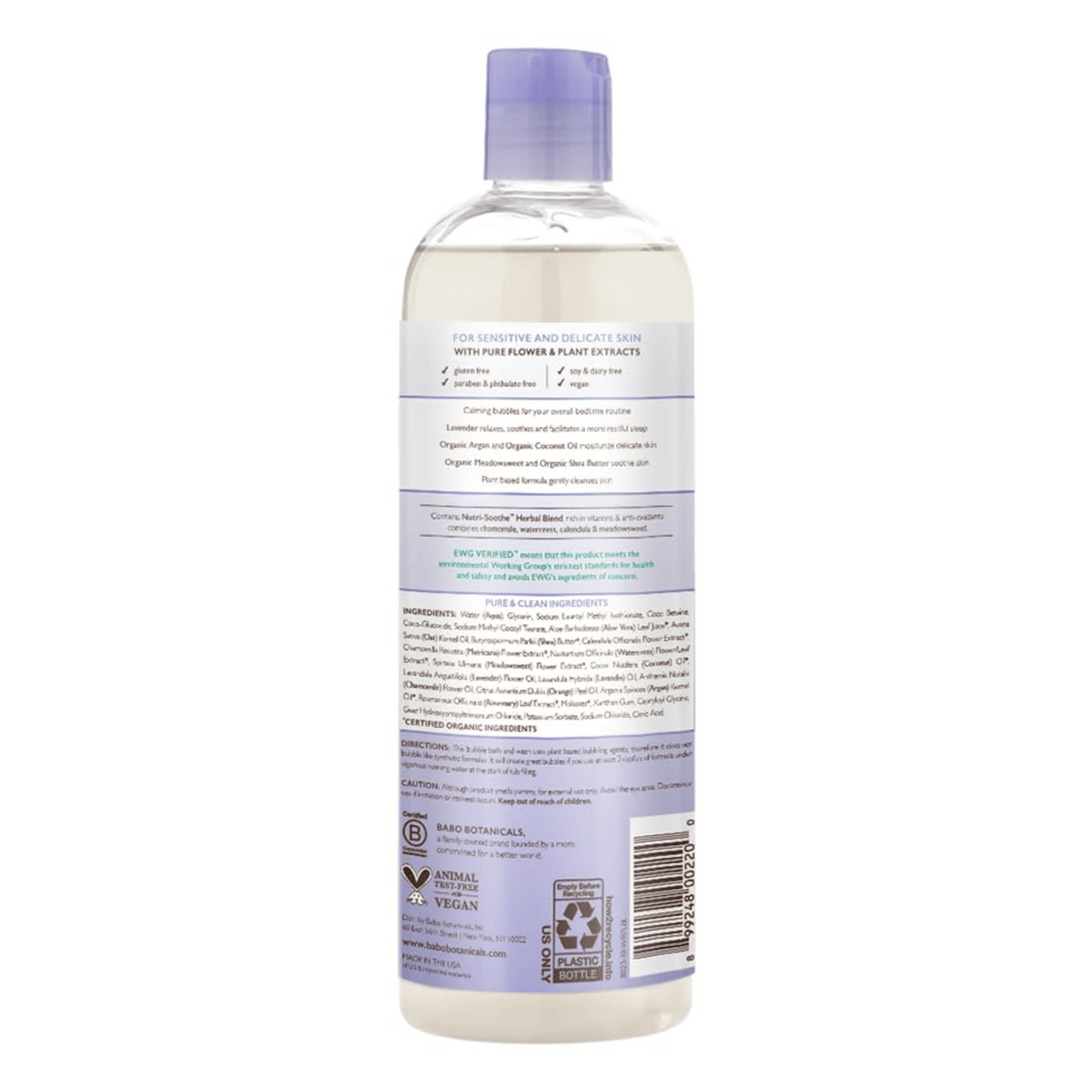 Let the power of lavender relax your senses. The soothing aromatherapy benefits of this calming 2-in-1 lavender bubble bath & wash help to comfort skin and relax the mind, especially as part of a bedtime routine. Formulated with argan and coconut oils to soften the skin while providing a gentle cleanse. The scent of lavender paired with chamomile envelopes you in warmth and helps decompress to prepare you for a good night’s sleep. Made with Babo Botanicals' certified organic Nutri-Soothe Blend, rich in vitamins, anti-oxidants, and nourishing botanicals like Chamomile, Watercress, Kudzu and Calendula. Suitable for all ages.