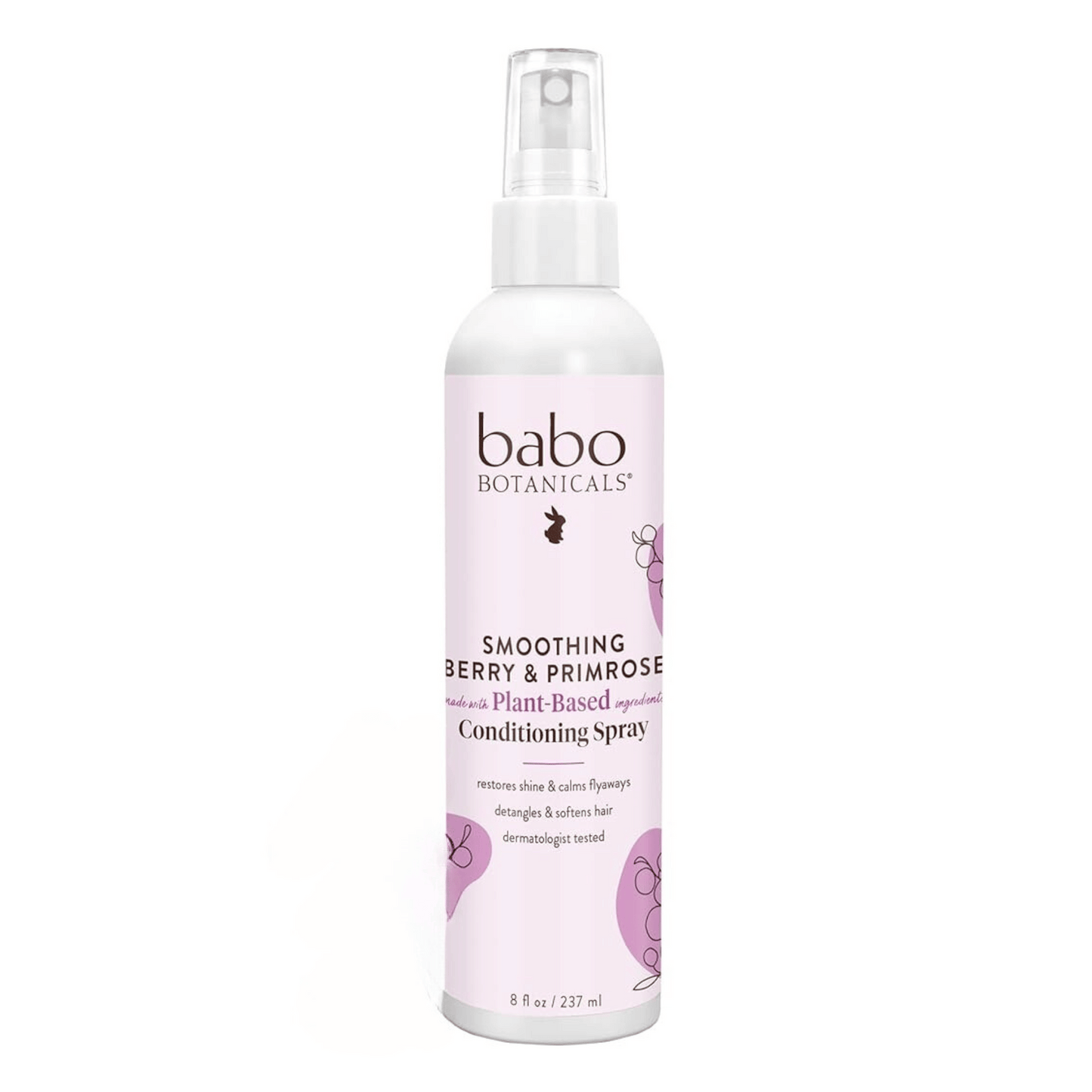 Leave the frizz behind! Smoothing Berry Primrose Conditioning Spray is created for all hair types prone to tangles, dryness and frizz. This lightweight, silicone-free conditioning spray formula detangles hair, eliminates frizz and flyaways, and restores natural definition and movement. Formulated with plant-based ingredients like evening primrose oil and blueberry extract to soften hair. Lightly scented with a soft berry natural fragrance, that leaves hair smelling fresh and clean. Suitable for all ages. Made with Babo Botanicals' certified organic Nutri-Soothe Blend, rich in vitamins, anti-oxidants, and nourishing botanicals like Chamomile, Watercress, Kudzu and Calendula.