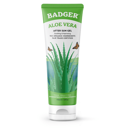 Badger Aloe Vera Gel soothes and hydrates thirsty skin. It is fair Trade Certified, vegan, cruelty free, packaged in a 50% PCR tube, and made with solar power. Lightweight and easily absorbed, aloe vera provides the perfect relief after sunny summer days—leaving your skin cooled and refreshed. Cools, soothes, and relieves sun-parched skin to leave it feeling hydrated and refreshed.