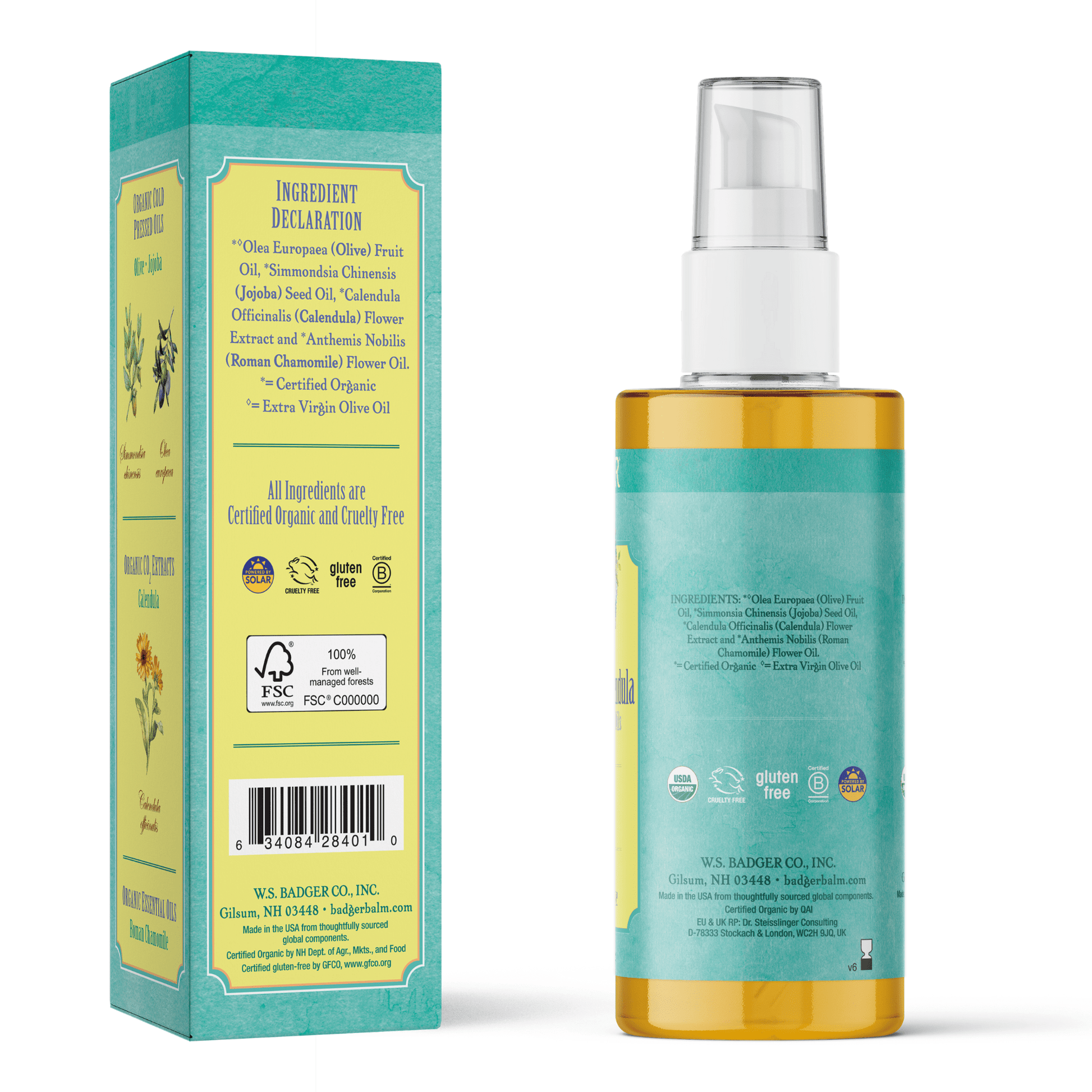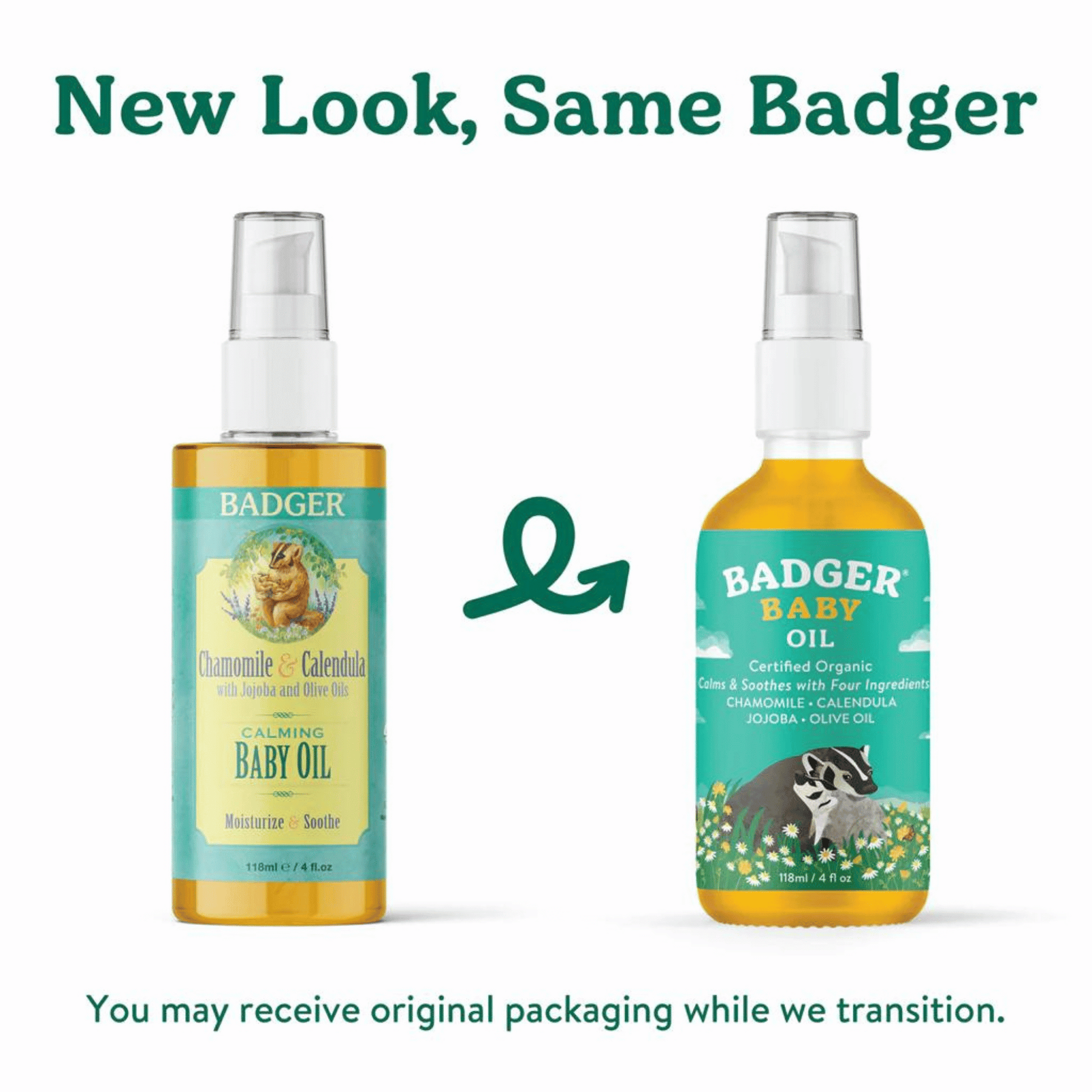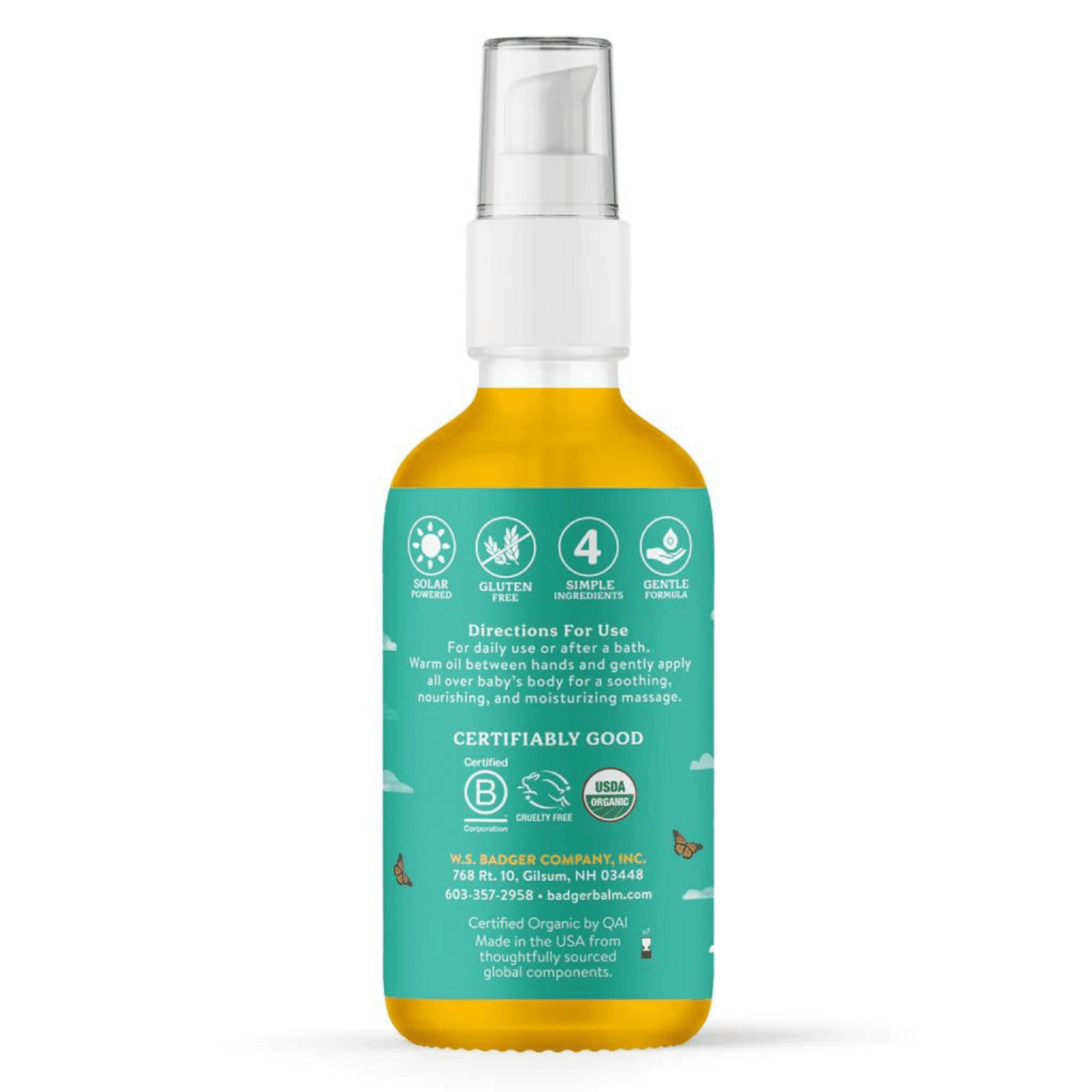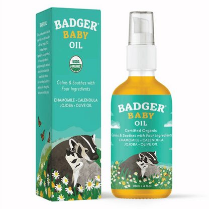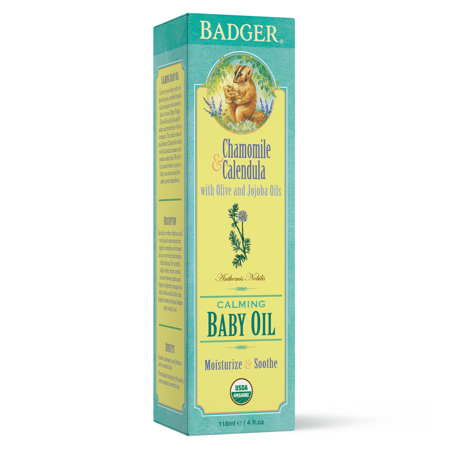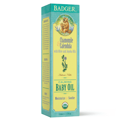 Looking for an organic way to soothe and moisturize your baby? Care for your loved ones with 100% natural, safe and soothing Badger Baby Oil. Formulated with moisturizing oils and calming herbs to nurture and protect delicate baby skin. Organic Extra Virgin Olive and Jojoba Oils gently soften and moisturize even the most delicate skin. The mild scent of true Roman Chamomile calms, while gentle Calendula soothes and protects. Here at Badger, we take baby care seriously and formulated these products using only the safest + purest ingredients. Gentle and great for sensitive skin. - Contains only Organic Extra Virgin Olive Oil, Jojoba Oil and extracts of Calendula and Chamomile - Calendula and Chamomile are traditional calming and healing herbs for babies - Great for sensitive skin of all ages - NO chemicals, synthetics, ''fragrance,'' parabens, GMOs, or any bad stuff you wouldn't want on a baby - Cruelty-Free - USDA Organic - Gluten-Free.