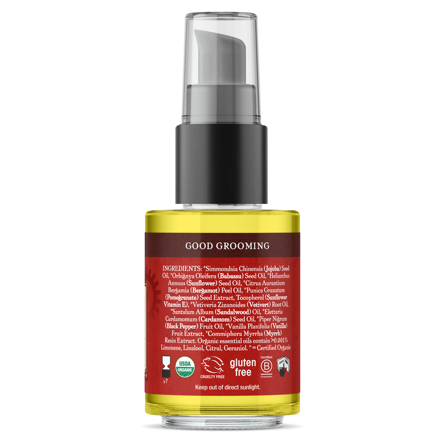 Organic Jojoba Oil, Organic Babassu Oil, Organic Sunflower Oil, Organic Bergamot Oil, Organic Pomegranate Extract, Sunflower Vitamin E, Organic Vetivert Extract, Organic Sandalwood Oil, Organic Cardamom Oil, Organic Black Pepper Oil, Organic Vanilla Extract & Organic Myrrh Extract.