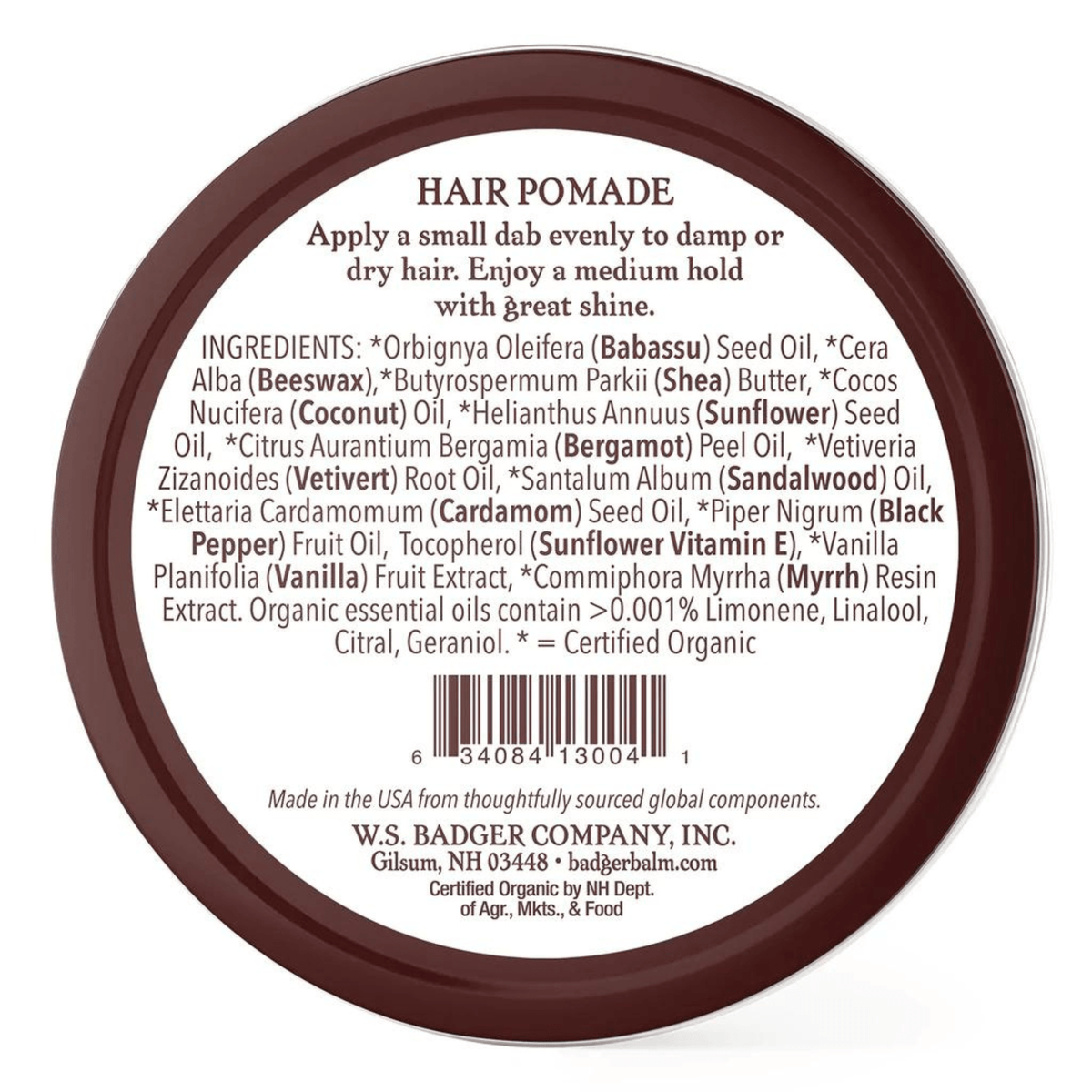*Steam Distilled Coconut Oil, *Coconut Oil, *Castor Oil, Candelilla Wax, *Beeswax, *Bergamot Oil, *Vetivert Oil, *Sandalwood Oil, *Cardamom Oil, *Black Pepper Oil, Sunflower Vitamin E, *Vanilla Extract, *Myrrh Extract. Organic essential oils contain >0.001% Citral, Linalool, Limonene, Farnesol, Geraniol.