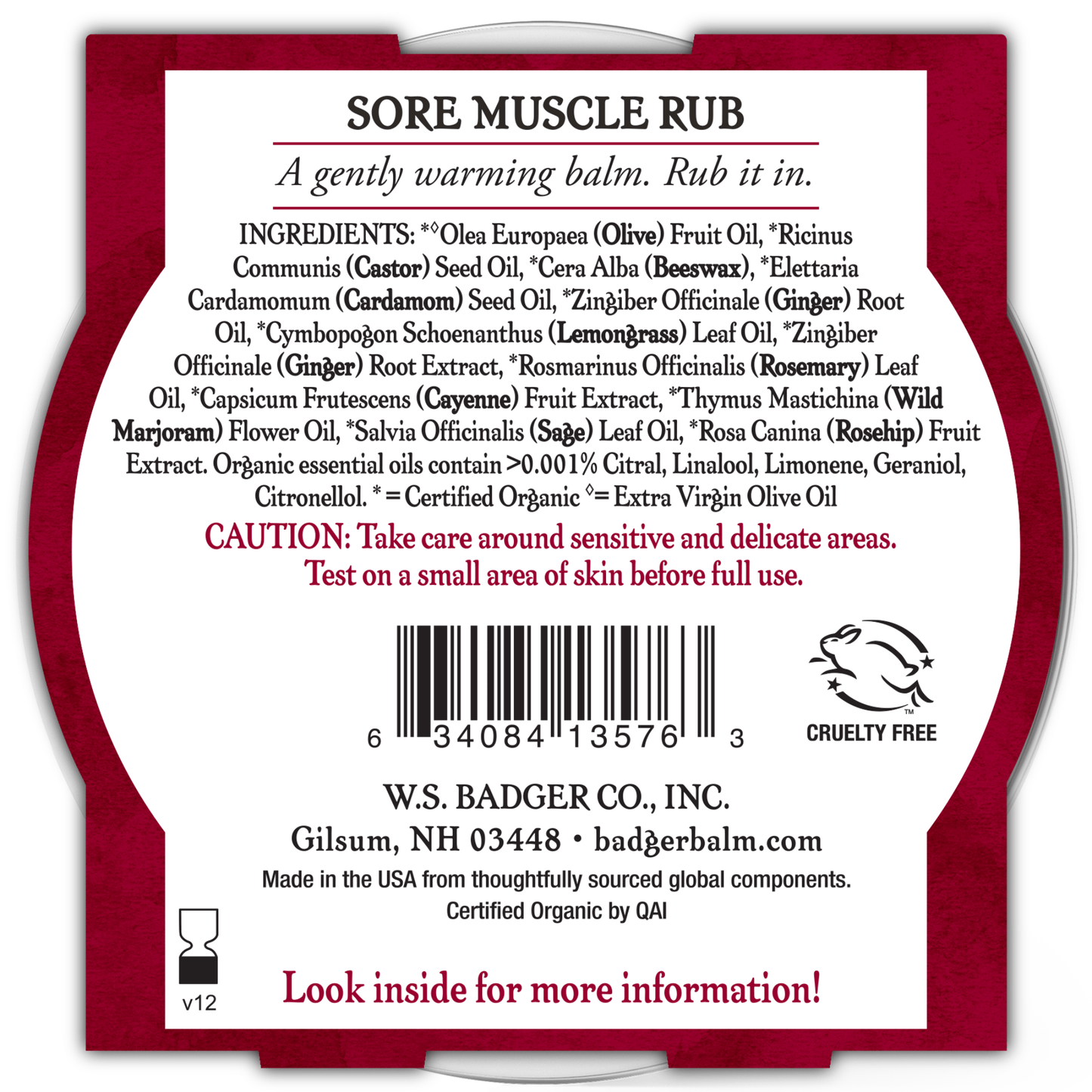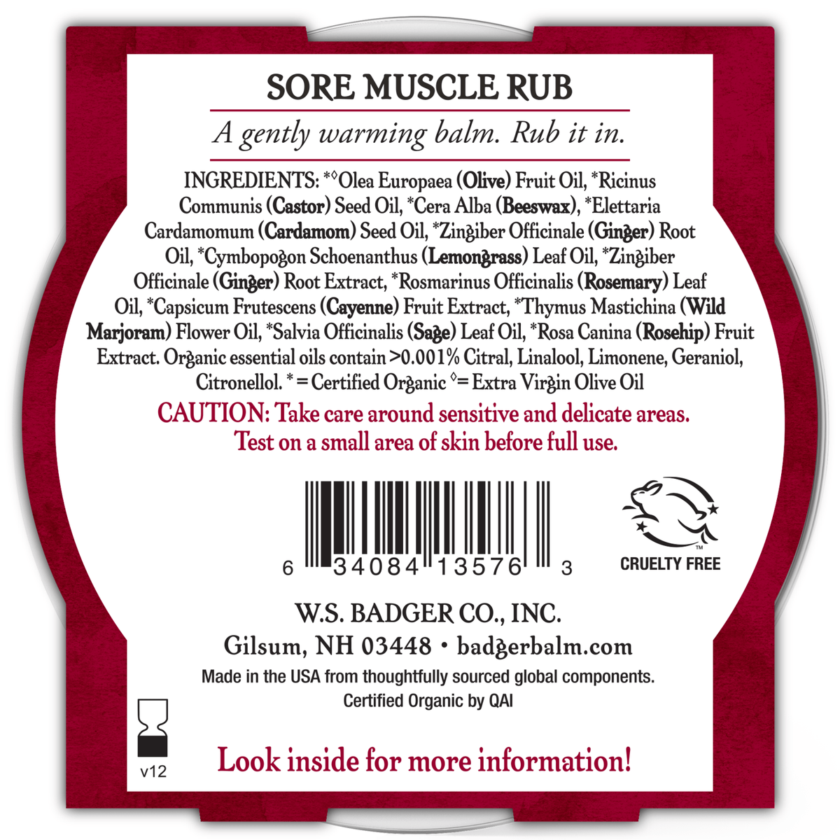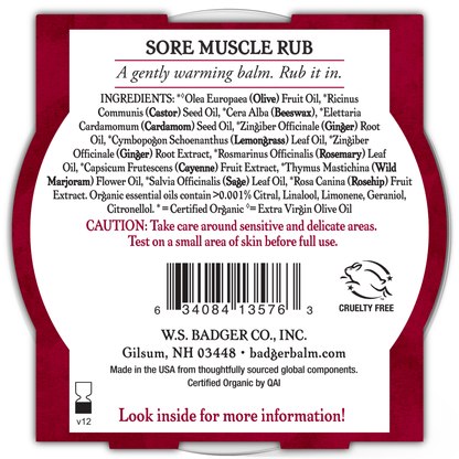 For your overworked, overplayed, strained, pulled, aching muscles, Sore Muscle Rub is portable warmth in a tin. No blast of ice cold or hot, just a nutrient rich formula with a lemon-ginger fragrance to leave your skin and muscles feeling better. Comes in portable tin.