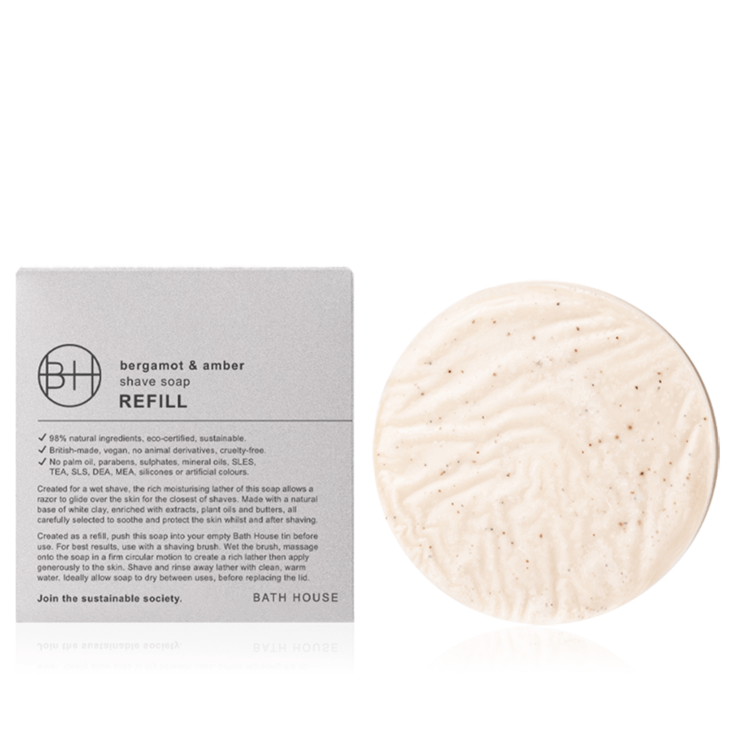 Created as a refill, push this soap into your empty Bath House tin before use. Suitable for use on the face and body. For best results, use with a shaving brush. Wet the brush, massage onto the soap in a firm circular motion to create a rich lather then apply generously to the skin. Shave and rinse away lather with clean, warm water.