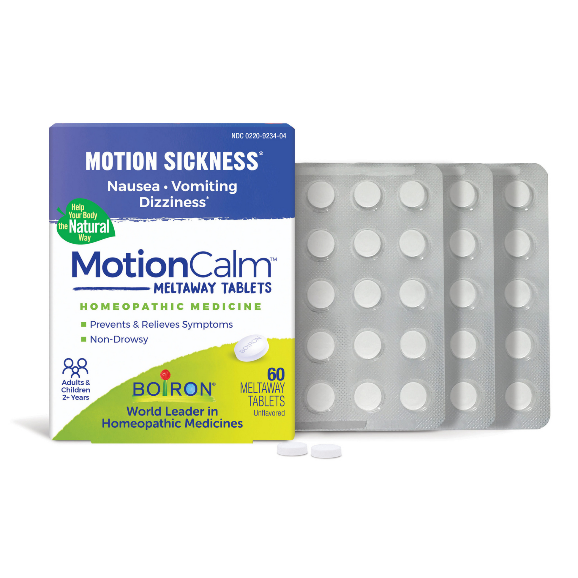 Boiron MotionCalm Meltaway Tablets help take the worry out of travel. This homeopathic medicine prevents and relieves nausea, vomiting, and dizziness associated with travel- related motion sickness. It's also useful for motion sickness from amusement rides or video games. Convenient and easy to use, the meltaway tablets dissolve in the mouth without food or water. Take the evening before and day of travel to prevent motion sickness or take on the spot whenever symptoms strike.