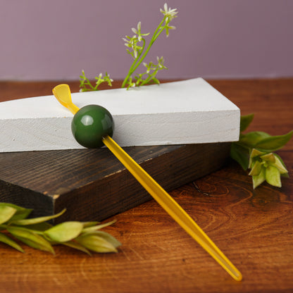 Delight in the decadent beauty of this classic style Tama Kanzashi hair stick. Made with an accent ball the color of natural matcha green tea, this lush hair accessory is perfect for those who crave trusted quality and classic style. Whether you're dressing up for a special occasion or just accenting your everyday look, this gorgeous hair stick is sure to turn heads. Choose your favorite color and let the luxuriousness of matcha green tea infuse your senses! Stick color may vary depending on shipment since these are hand made