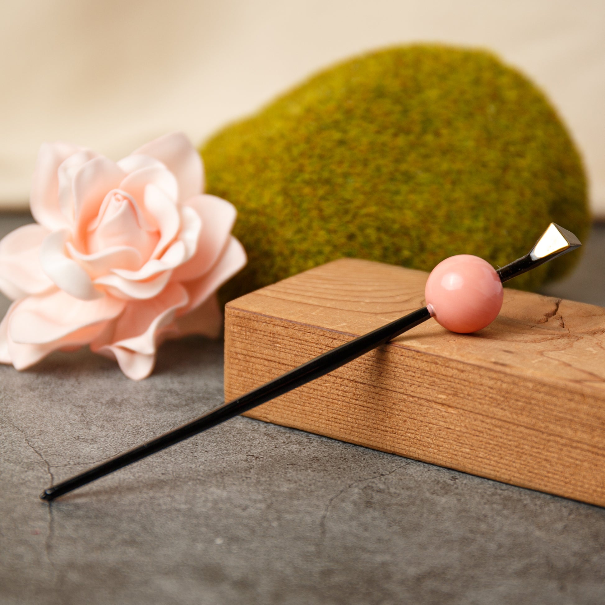 This simple coral tama kanzashi is a very classic and beautiful hair accessory It is often worn by Maiko in Japan and can be paired with more decorative kanzashi hair sticks.