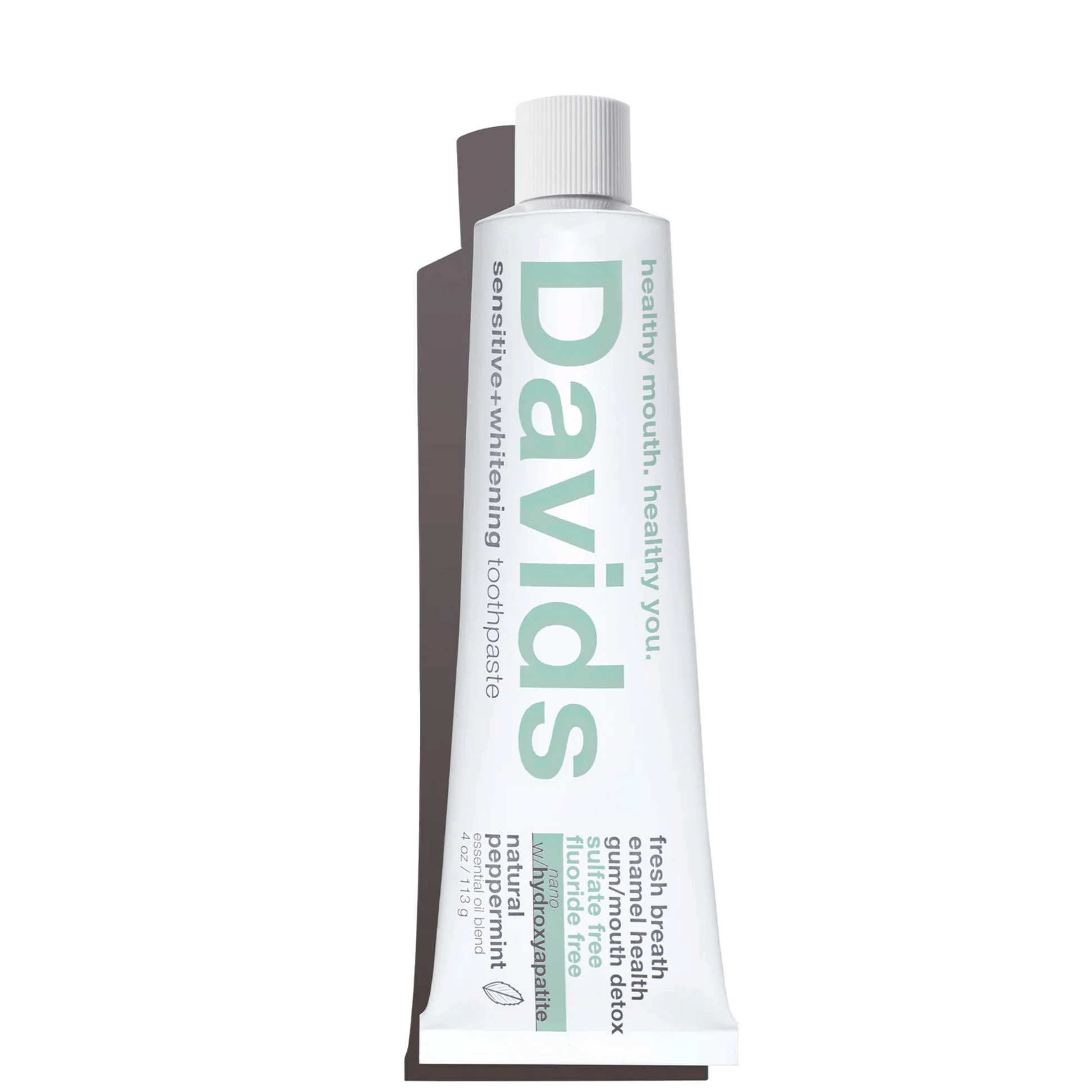 This all natural toothpaste repairs sensitive teeth and remineralizes enamel using nano-hydroxyapatite (n-HA). The high performance safe + clean ingredients offer natural whitening properties, plaque protection, and fresh breath. Davids Toothpaste is flavored with premium natural peppermint oil.