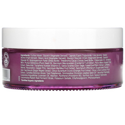 Purified Water, Glycerin (Vegetable Derived), Caprylic/Capric Triglyceride, Cetyl Alcohol, Stearyl Alcohol (Plant Derived), Stearic Acid (Vegetable Derived), Glyceryl Stearate Citrate (Vegetable Derived), Glyceryl Stearate SE, Butyrospermum Parkii (Shea) Butter, Theobroma Cacao (Cocoa) Seed Butter, Polysorbate 20, Dimethyl MEA, Prunus Domestica (Plum) Seed Oil, Vaccinum Macrocarpon (Cranberry) Fruit Extract, Pyrus Malus (Apple) Fruit Extract, Bakuchiol, Tocopheryl Acetate (Vitamin E), Salvia Sclarea (Clary Sage) Flower/Leaf/Stem Extract, Caffeine, Retinol, Resveratrol, Copper PCA, Vaccinium Myrtillus Fruit Extract, Saccharum Officinarum (Sugarcane) Extract, Acer Saccharum (Sugar Maple) Extract, Citrus Aurantium Dulcis (Orange) Fruit Extract, Citrus Limon (Lemon) Fruit Extract, Camellia Sinensis (Green Tea) Polyphenols, Simmondsia Chinensis (Jojoba) Seed Oil*, Ascorbyl Palmitate, Lavandula Angustifolia (Lavender) Oil, Allantoin, Panthenol (Provitamin B5), Xanthan Gum, Sodium Hydroxide, Leuconostoc/Radish Root Ferment Filtrate, Potassium Sorbate, Ethylhexylglycerin, Phenoxyethanol.