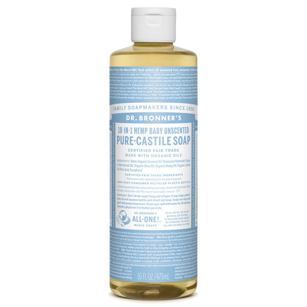 With no added fragrance and double the olive oil, Dr. Bronner's Baby Unscented Pure-Castile Liquid Soap is good for sensitive skin ? babies too (though not tear-free!). This unscented soap is also well suited for fragrance sensitive adults. Dr. Bronner's soap is concentrated, biodegradable, versatile and effective. Made with organic and certified fair trade ingredients, packaged in a 100% post-consumer recycled bottle. This all-in-one soap is good for just about any cleaning task. Face, body, hair ? food, dishes, laundry, mopping, pets - Clean your house and body with no synthetic preservatives, detergents or foaming agents. Easily diluted for various cleaning needs.