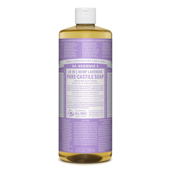 Scented with pure lavender and lavandin oils to calm the mind and soothe the body! Dr. Bronner's Pure-Castile Lavender Liquid Soap is concentrated, biodegradable, versatile and effective. Made with organic and certified fair trade ingredients, packaged in a 100% post-consumer recycled bottle. All-One!Suggested Uses: Dr. Bronner's 18-in-1 Pure-Castile Soaps are good for just about any cleaning task. Face, body, hair ? food, dishes, laundry, mopping, pets ? clean your house and body with no synthetic preservatives, detergents or foaming agents. Remember to Dilute!