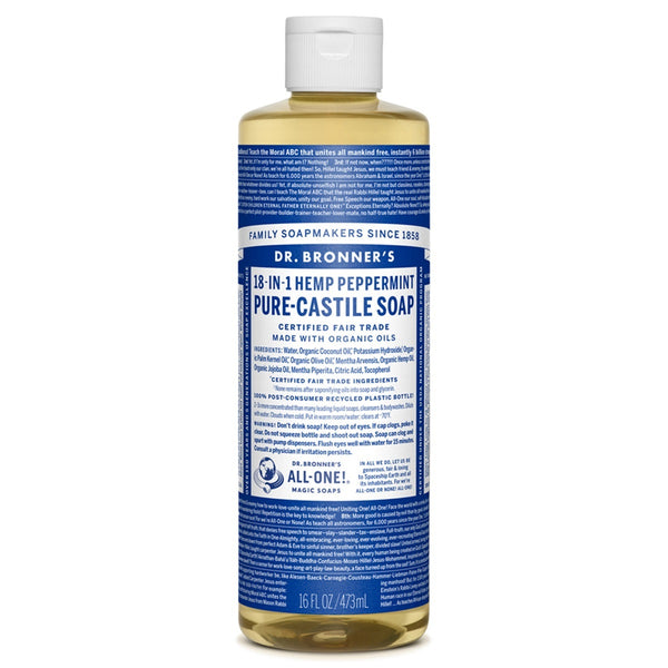 The most popular scent ? with a peppermint burst so pure it tingles! Scented with organic peppermint oil to cool skin, clear sinuses and sharpen mind. Dr. Bronner's Peppermint Pure-Castile Liquid Soap is concentrated, biodegradable, versatile and effective. Made with organic and certified fair trade ingredients, packaged in a 100% post-consumer recycled bottle. All-One!Suggested uses: Dr. Bronner's 18-in-1 Pure-Castile Soaps are good for just about any cleaning task. Face, body, hair ? food, dishes, laundry, mopping, pets ? clean your house and body with no synthetic preservatives, detergents or foaming agents. Remember to dilute!