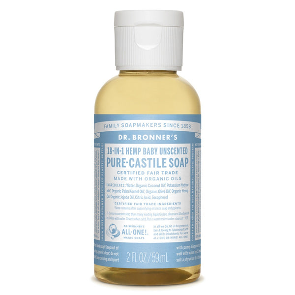 With no added fragrance and double the olive oil, Baby Unscented Castile Liquid Soap is good for sensitive skin and babies too (though it isn't tear-free!). Dr. Bronner's soap is concentrated, biodegradable, versatile and effective. Made with organic and certified fair trade ingredients, packaged in a 100% post-consumer recycled bottle. Dr. Bronner's 18-in-1 Pure-Castile Soaps are good for just about any cleaning task. Face, body, hair ? food, dishes, laundry, mopping, pets ? clean your house and body with no synthetic preservatives, detergents or foaming agents ? none! Just remember to dilute!