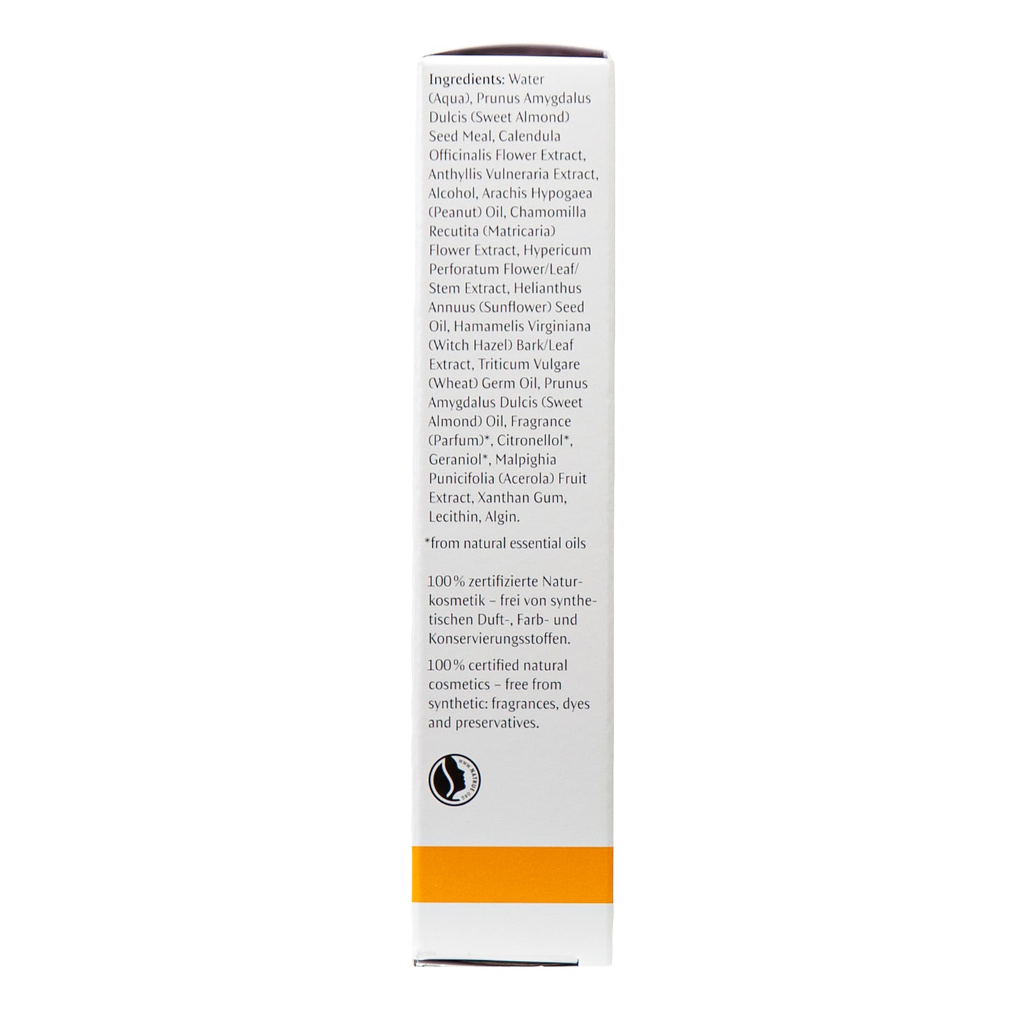 Water (Aqua), Prunus Amygdalus Dulcis (Sweet Almond) Seed Meal, Calendula Officinalis Flower Extract, Anthyllis Vulneraria Extract, Alcohol, Arachis Hypogaea (Peanut) Oil, Chamomilla Recutita (Matricaria) Flower Extract, Hypericum Perforatum Flower/Leaf/Stem Extract, Helianthus Annuus (Sunflower) Seed Oil, Hamamelis Virginiana (Witch Hazel) Bark/Leaf Extract, Triticum Vulgare (Wheat) Germ Oil, Prunus Amygdalus Dulcis (Sweet Almond) Oil, Fragrance (Parfum), Citronellol*, Geraniol*, Malpighia Punicifolia (Acerola) Fruit Extract, Xanthan Gum, Lecithin, Algin *Component of natural essential oils