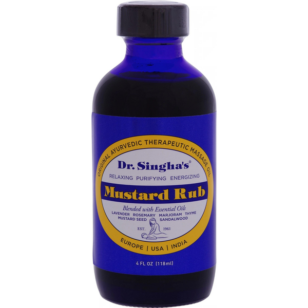 Relax with a delightful aromatic massage oil that aids in opening pores, easing muscle tension and soothing nerves. Dr. Singha's Mustard Rub is a warming and relieving massage oil, popular at spas, with massage therapists, chiropractors and all lovers of touch. To maximize its therapeutic benefits, you can apply it as a rub after a hot Dr. Singha's Mustard Bath.
