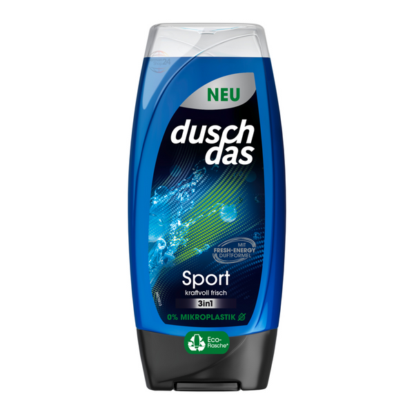 Start your day with the revitalizing and refreshing Duschdas 3-in-1 Shower Gel & Shampoo Sport with a powerful fresh fragrance formula. Immerse yourself in the freshness of a waterfall – that’s how the powerfully fresh scent feels, activating the muscles and reviving all your strength. The practical combination of shower gel and shampoo is applicable for body, face and hair and provides refreshing moments in everyday life.