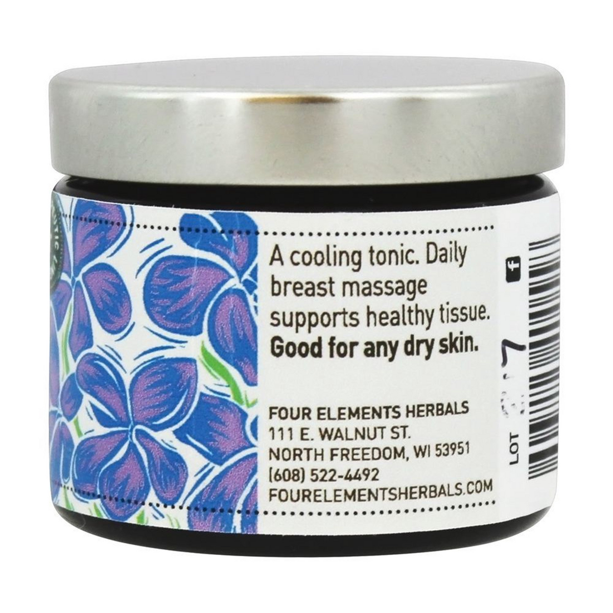 Four Elements Violet Burdock Breast & Body Balm, named American Herbalists Guild’s 2014 Best Topical Skin Product, is a unique balm formulated with wild violets, burdock root, Scrophularia, and poke root - classic herbs used to support healthy lymph function. Combined with chamomile and orris root essential oils, the scent is like a spring morning. The result is a cooling, potent and delightful cream that your skin will love! Daily breast massage with Four Elements' Violet Burdock Breast & Body Balm supports healthy tissue.