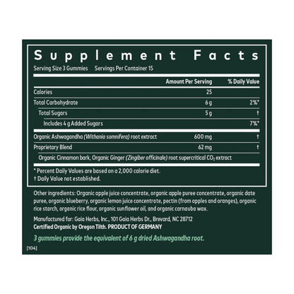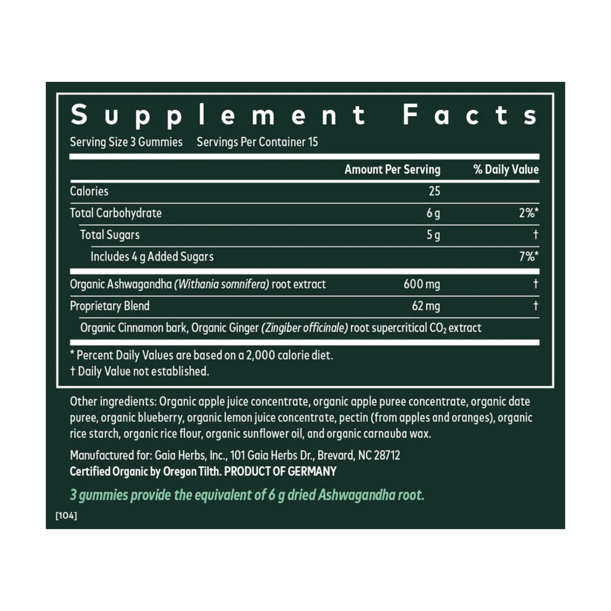 Ashwagandha is an adaptogen. Adaptogens read your body’s needs in trying times and smooths out its stress response cycle. This ancient herb has been revered for more than 1,500 years for its ability to help the body cope with life’s challenges. Each serving of these gummies delivers the equivalent of 6,000 mg of dry Ashwagandha root. Each gummy is flavored with the taste of Ginger and Cinnamon—sweetened with real fruit. They are naturally sweet from blueberry, apple, and date, with no refined sugar and nothing artificial.