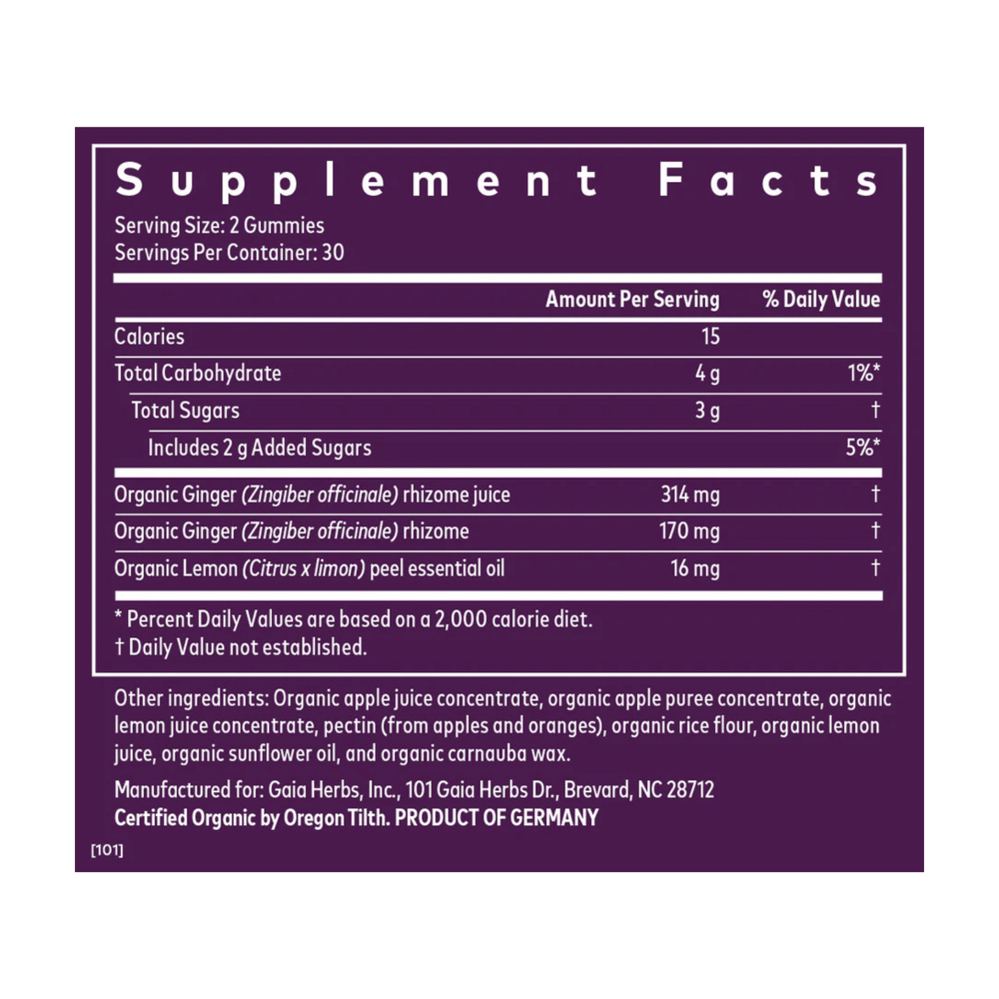 Other ingredient: Organic Lemon peel essential oil, organic juice apple concentrate, organic apple puree concentrate, organic lemon juice concentrate, pectin (from apples and oranges), organic rice flour, organic lemon juice, organic sunflower oil, and organic carnauba wax.Adults chew 2 gummies, up to 3 times daily as needed; up to 6 gummies per day