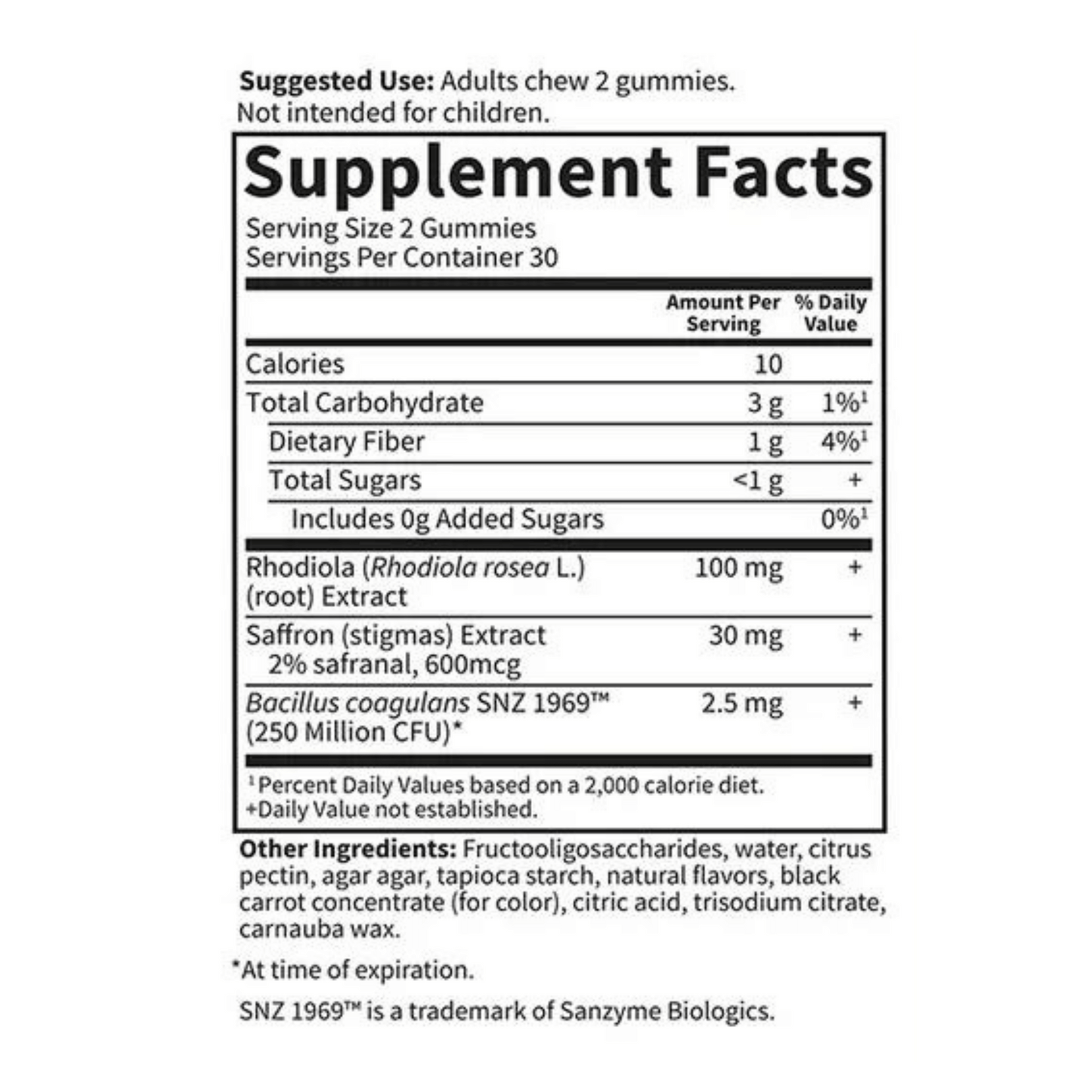 The ability to chill and uplift your mood has never been easier—or more delicious! Garden of Life Herbals Stress Relief offers stress gummies that are chock full of ingredients to support mood, stress, and digestive health. These yummy gummies contain 100mg of the adaptogen rhodiola—which has been shown to provide resistance to stress response. Stress Relief gummies also contain 30mg of saffron, a traditional cooking spice, which has been clinically shown to support stress and mood. And they've added clinically studied soil-based probiotic B. coagulans SNZ 1969™ plus prebiotics to support digestive health. All of this relieving goodness is wrapped up into yummy, berry-flavored gummies with <1g of sugar per 2-gummy serving. Non-GMO Project Verified and NSF Certified Gluten Free, you can chill out knowing these delicious gummies are third-party verified.