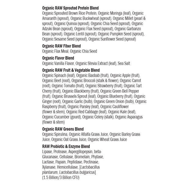 Organic RAW Protein & Greens Blend: Organic sprouted brown rice protein, organic pea protein, organic spinach (leaf), organic chia protein, organic alfalfa grass juice, organic broccoli (stalk & flower), organic navy bean (sprout), organic lentil bean (sprout), organic garbanzo bean (sprout), organic carrot (root), organic beet (root), organic kale (leaf), Organic Flavor Blend: organic vanilla flavors, organic stevia extract (leaf) RAW Probiotic & Enzyme Blend: lipase, protease, aspergillopepsin, beta-glucanase, cellulase, bromelain, phytase, lactase, papain, peptidase, pectinase, xylanase, hemicellulase, [lactobacillus plantarum, lactobacillus bulgaricus] (1.5 billion cfu)