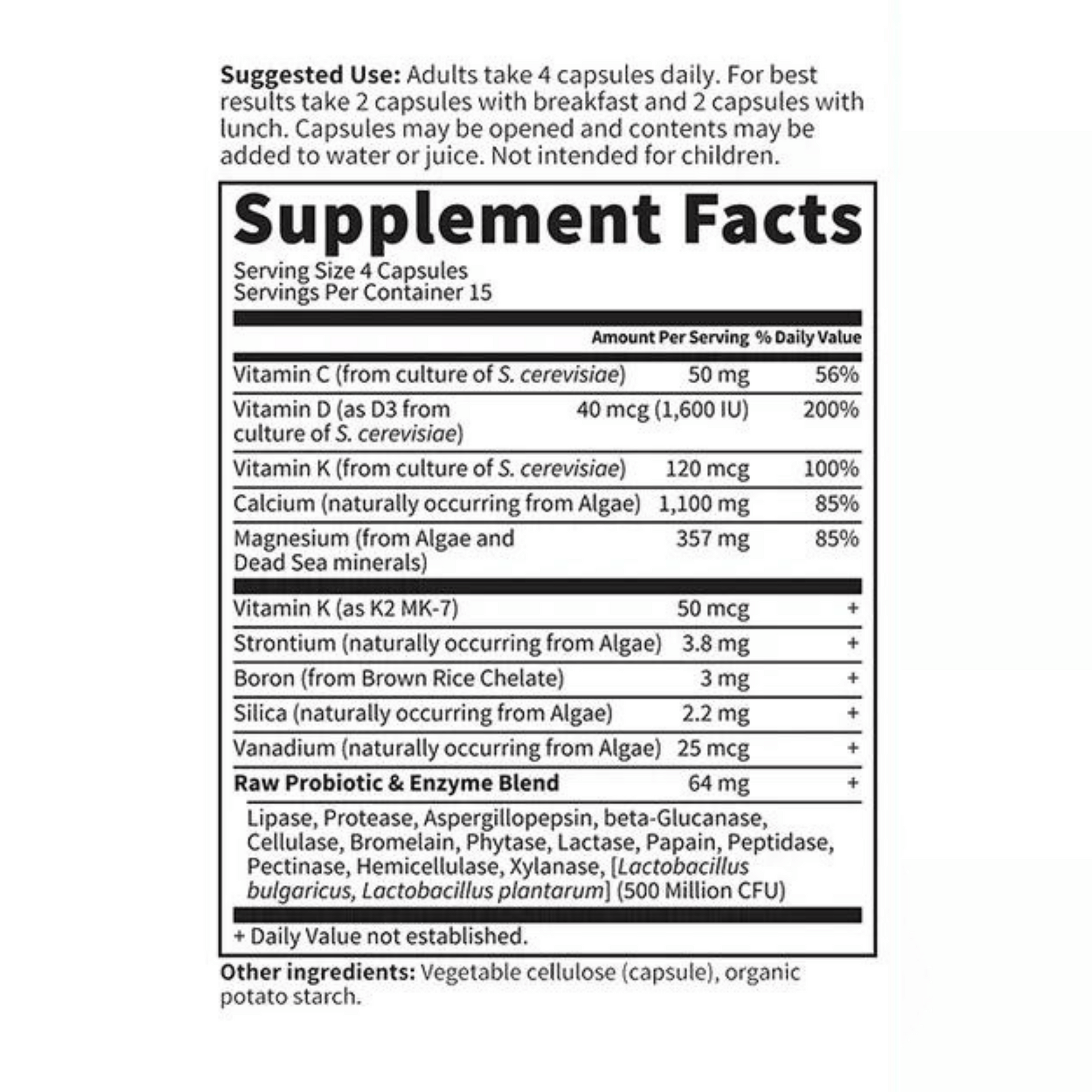 Vitamin C50 mg,Vitamin D31600 IU,Vitamin K2100 mcg,Calcium756 mg,Magnesium386 mg,Boron3 mg,Silica2.2 mg,Strontium3.8 mg,Vanadium68 mcg,RAW Probiotic and Enzyme Blend:Saccharomyces boulardii, Protease, Phytase, beta-Glucanase, alpha-Galactosidase, Hemicellulase, Cellulase 75 mg,RAW Organic Fruit and Vegetable Blend: Organic Strawberry, Organic Cherry, Organic Blackberry, Organic Blueberry, Organic Raspberry, Organic Beet Juice, Oganic Carrot Juice, Organic Spinach Juice, Organic Broccoli Juice, Organic Tomato Juice, Organic Kale Juice, Organic Red Cabbage Juice, Organic Parsley Leaf Juice, Organic Brussels Sprout Juice, Organic Bell Pepper Juice, Organic Cucumber Juice, Organic Celery Juice, Organic Garlic Juice, Organic Ginger Root Juice, Organic Green Onion Juice, Organic Cauliflower Juice, Organic Asparagus Juice 20 mg Other Ingredients: Saccharomyces cerevisiae, vegetable capsule (cellulose), lactobacillius bulgaricus, natto (fermented soy).