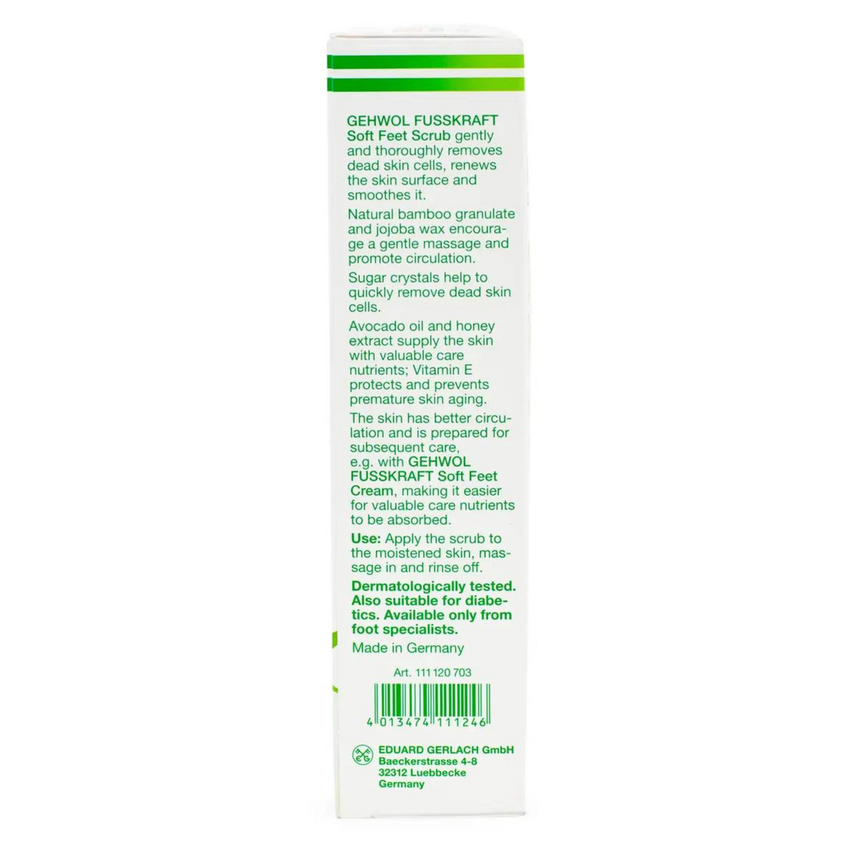 The Gehwol Soft Feet Scrub Gently and thoroughly removes dead skin cells and renews the skin surface leaving a smooth appearance. Natural granulated bamboo and jojoba wax encourage a gentle massage and promote circulation. Sugar crystals help to quickly remove dead skin cells while avocado oil and honey extract supply the skin with valuable nutrients and Vitamin E protects the skin. This leaves the skin with better circulation and prepared for subsequent care, like Gehwol's Soft Feet Cream. Making it easier for valuable care ingredients to be absorbed. The pleasant scent of the Gehwol Soft Feet Scrub lends to the wonderful feeling of well cared for legs and feet. Suitable for Diabetics.