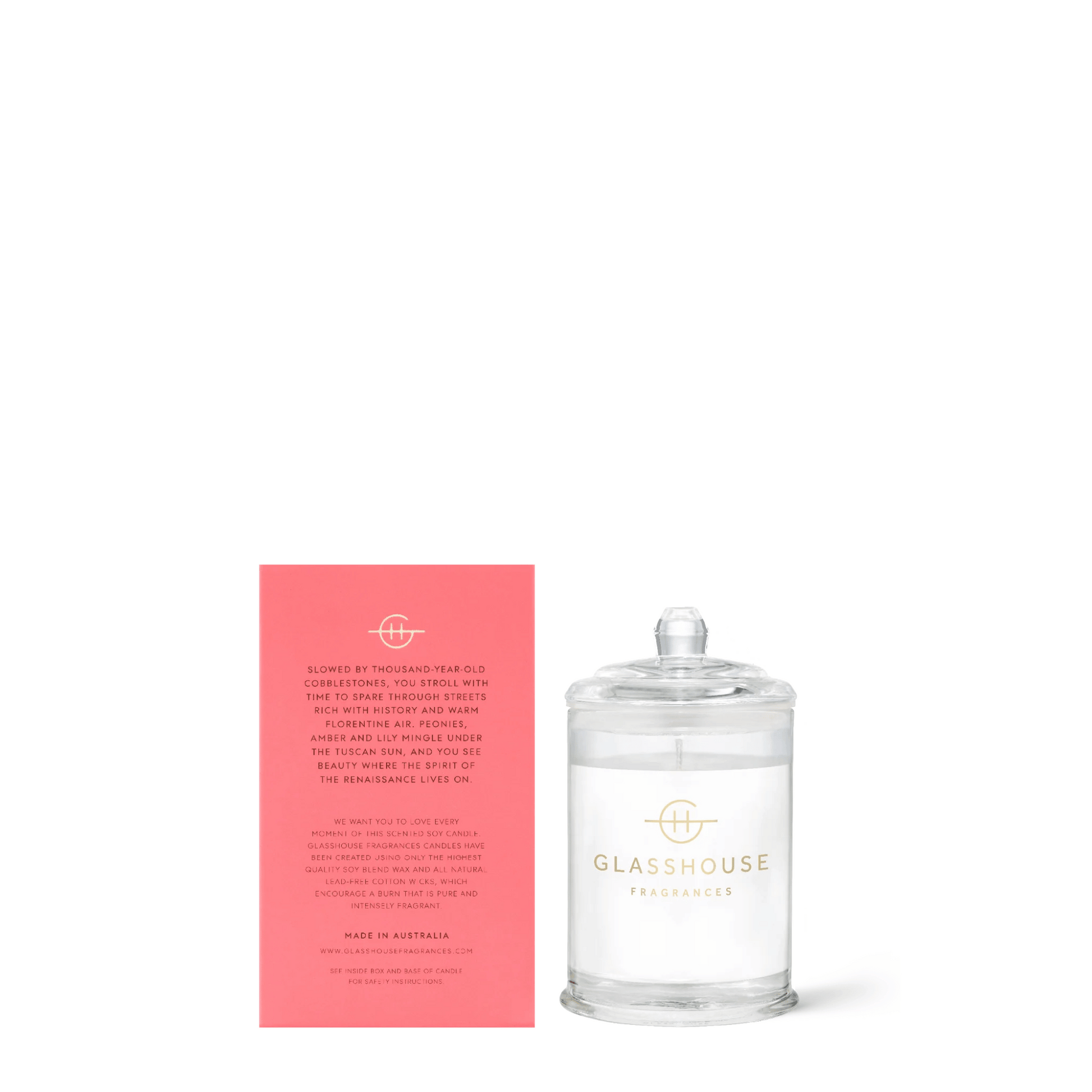 A travel-sized mini perfect for a portable sensory escape. A flower market under the Tuscan sun. You pick up peonies, jasmine and a hint of peach. Slowed by thousand-year-old cobblestones, you stroll with time to spare through streets rich with history and warm Florentine air. Peonies, amber and lily mingle under the Tuscan sun, and you see beauty where the spirit of the Renaissance lives on.