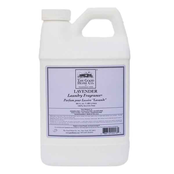 Good Home's Lavender Laundry Fragrance and fabric softener comes in a convenient 64 fl oz plastic jug. Biodegradable, cruelty free, 100% vegan, and never made with parabens, phosphates, sulfates, or phthalates.