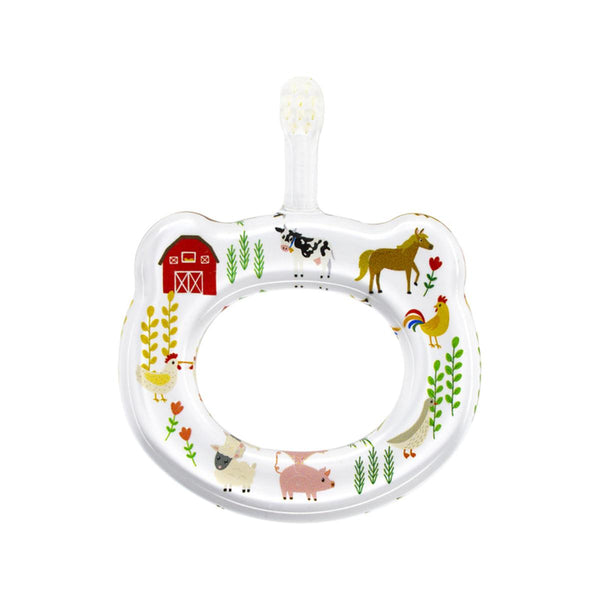 The Hamico Baby toothbrush introduces your baby to oral care and makes it a pleasurable chore. Gone are the days of tears and even injuries from toothbrushes that just aren't right for your child. Imagine instead, precious family time learning to brush teeth!Breakthrough design elements include a wide, easy to hold handle that is completely safe. Long straight handles can accidentally poke and injure your baby. The short neck and specially sized head fit perfectly in baby's mouth, easily reaching all their teeth without extending too far. With Hamico's specially designed soft bristles, you can clean teeth and caress gums without scratching. FEATURES:- An extra wide, flat handle for excellent control. Prevents over-reach of the brush into your baby's mouth- Small head and short bristles fit comfortably in baby's mouth- Rounded bristles remove food and plaque easily with gentle brushing- Designs cannot be peeled off and be swallowed by accident due to the original printing technique- Easy to hold handle makes brushing a very pleasant and natural experience for both parents and babies