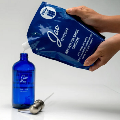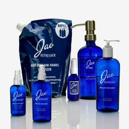 98.5% natural, multipurpose Jao Refresher™ is an instant disinfectant and aromatherapy boost in one. Kills germs and freshens hands with 65% plant-based Ethyl Alcohol and Jao Brand's very own blend of antiseptic essential oils: Lavender, Tea Tree, Eucalyptus, Geranium and Sage.