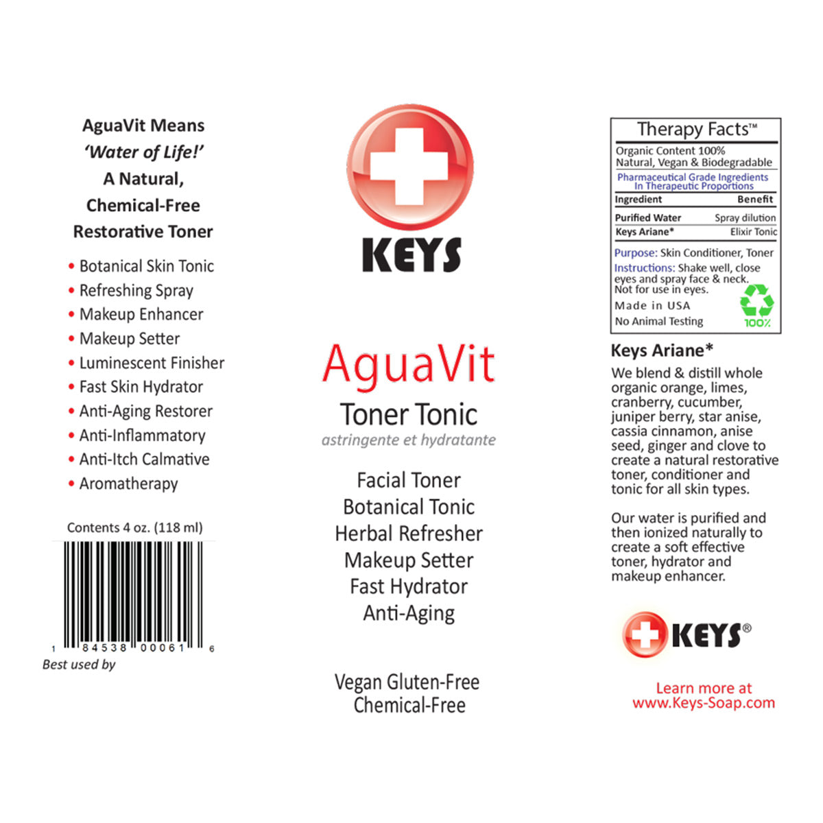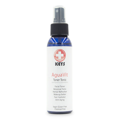 AguaVit is more than a toner. Take one sniff and the scent conjures deeply rooted emotions of times gone by. Use it as a: - Botanical Skin Toner - Refreshing Dry Skin Spray - Makeup Enhancer - Makeup Setter - Fast Skin Hydrator - Anti-Aging Skin Restorer - Fresh Light Scent AguaVit means ''Water of life.'' It is made from a functional ingredient created by Keys called Arianne. To make Arianne the folks at Keys blend + distill whole organic orange, lime, cranberry, cucumber, juniper berry, star anise, cassia cinnamon, anise seed, ginger and clove. Far more than just a toner, the aromatherapy of AguaVit is designed to lift the spirits, build confidence while also performing special functions to care for the skin as well as improve the performance of makeup. Like all Keys products, AguaVit is chemical-free, all-natural, vegan, and gluten-free. The ingredients are blended and then distilled to create the functions that the folks at Keys want to achieve on the skin. Vegan, Gluten-Free, Soy-Free, No Animal Testing, Chemical-Free, No Preservatives.