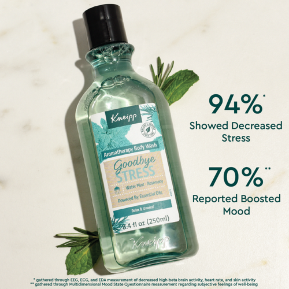 Enjoy your Kneipp moment for a clear head. The Kneipp Goodbye Stress Shower Gel gently cleanses, preserves the skin's natural moisture, and protects the skin's natural microbiome. The fragrance of water mint and rosemary is proven to transform stress into positive energy. Leave the hectic daily routine behind you.