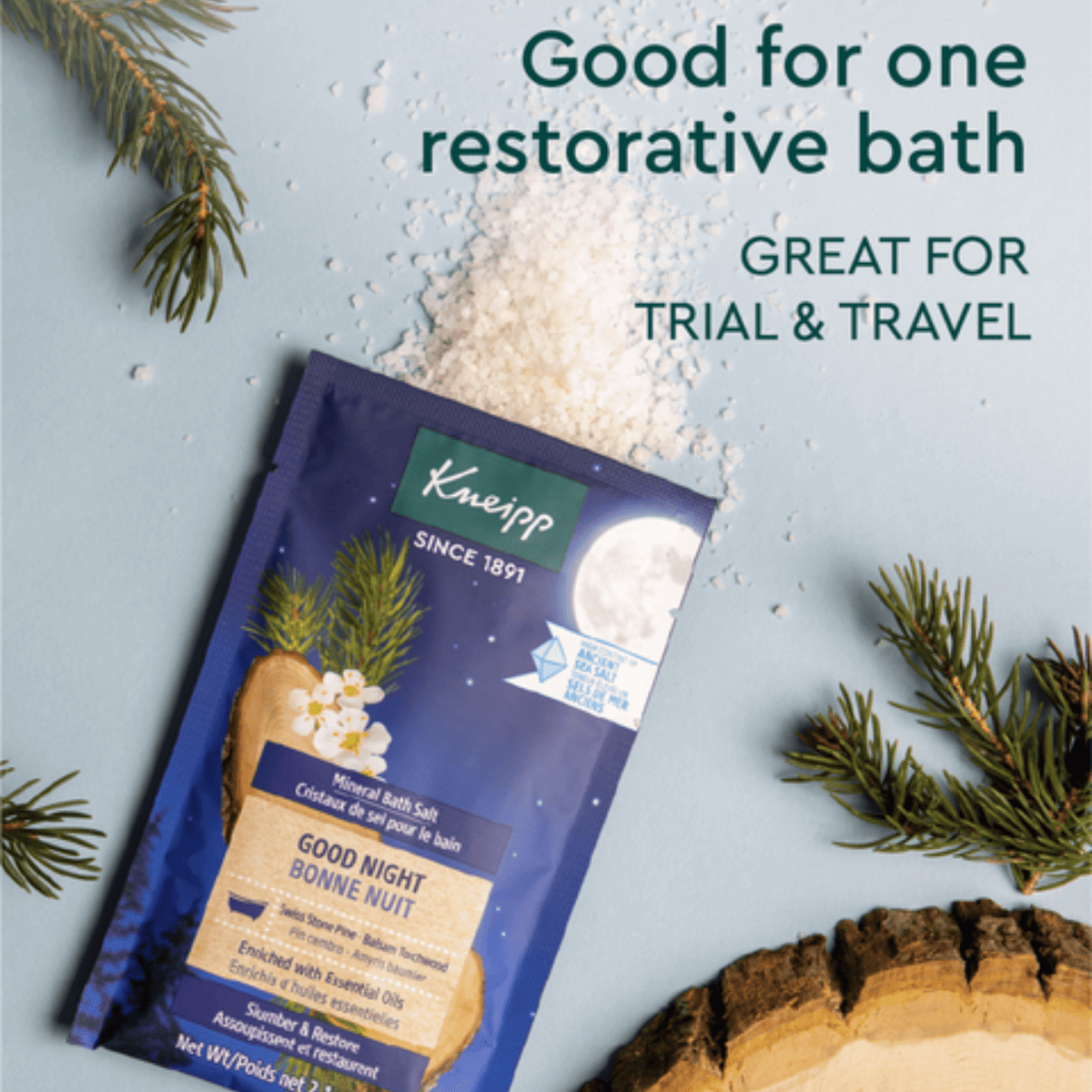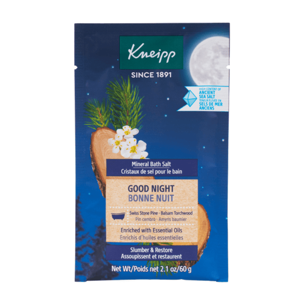 Get into a bedtime state of mind with Kneipp' Swiss Stone Pine Good Night Bath Crystals. Formulated with natural Swiss stone pine and amyris, this ultra-comforting bath formula is best used at night. It is clinically shown to help 94% of users sleep soundly and wake up restored. The soothing warm, woody fragrance and clear bathwater, will calm your mind, helping you fall asleep more easily and wake up refreshed the next morning.