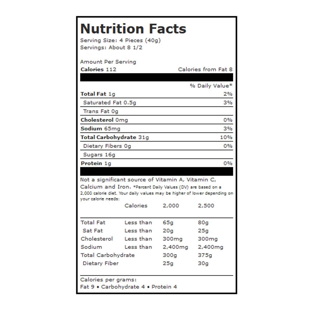 Glucose Syrup (from wheat contains sulphites), Flour, Sugar, Water, Citric Acid, Licorice Extract, Strawberry Flavor, Color (FD&C Red #40), Mono and Diglycerides (emulsifier), Salt, Potassium Sorbate (preservative), Vegetable Oil and Carnauba Wax (glazing agents). May contain traces of peanuts and other nuts.
