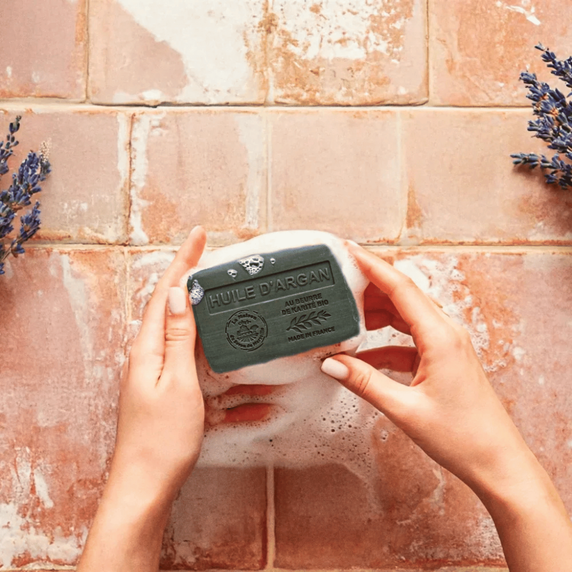 La Maison du Savon de Marseille solid soap with argan oil, handcrafted in Provence, is formulated with 100% vegetable oils and enriched with organic shea butter for complete skin care. Rich in vitamins, it gently cleanses the skin while providing moisture, suppleness and protection.