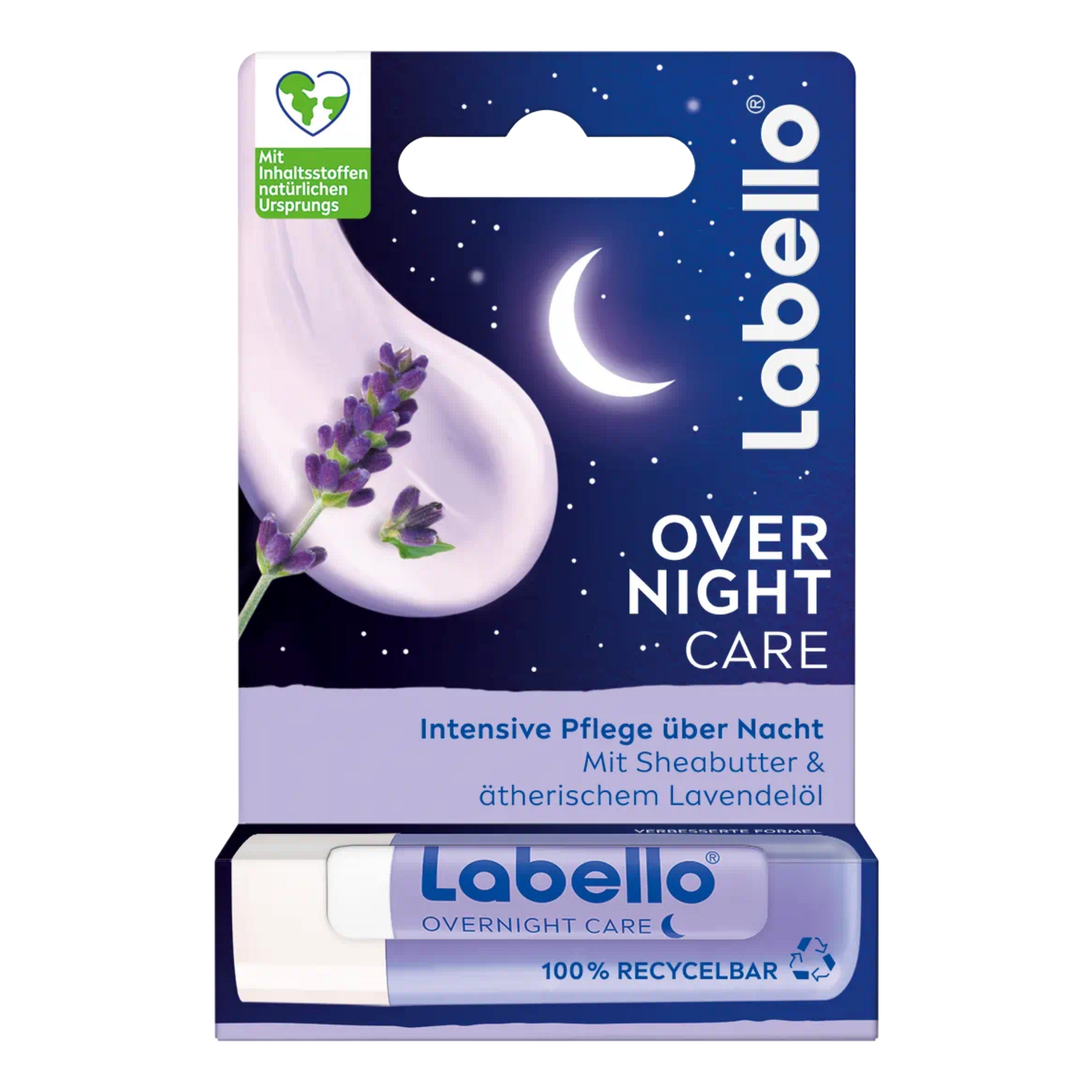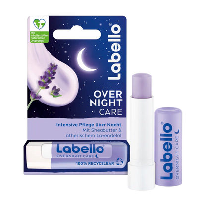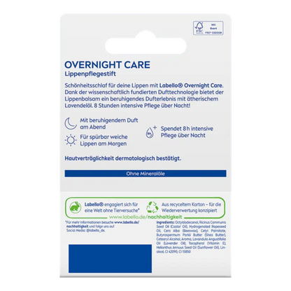 Labello Overnight Care Lavender offers intensive nighttime care for supple and regenerated lips until the morning. Discover your moment of rest before falling asleep with the Labello Overnight Care! The ideal addition to your daily evening routine. Thanks to scientifically based scent technology, the lip balm provides a soothing scent experience with essential lavender oil. The formula with shea butter and nourishing natural oils pampers and soothes the lips overnight. Start the day with noticeably soft and delicately cared for lips. Experience the loving care of Labello Overnight Care for lips that feel refreshed and ready for a new day. Experience relaxing and intensive lip care with Labello Overnight Care Lavender for a restful night and a perfect start to the day.