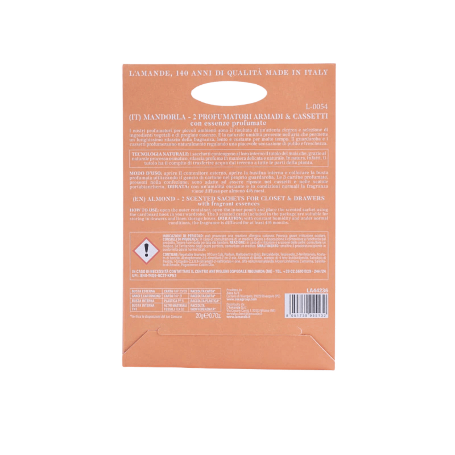 Embrace the delicious scent of almond with these delightful slow release sachets. These fresheners can be used in your closets, wardrobes, drawers or small spaces to create a clean and fresh aroma. L'amande has crafted these sachets with careful research to select the finest plant ingredients and essences. This unique form of home fragrance uses the natural humidity in the air to create such a long and sustained release of fragrance.