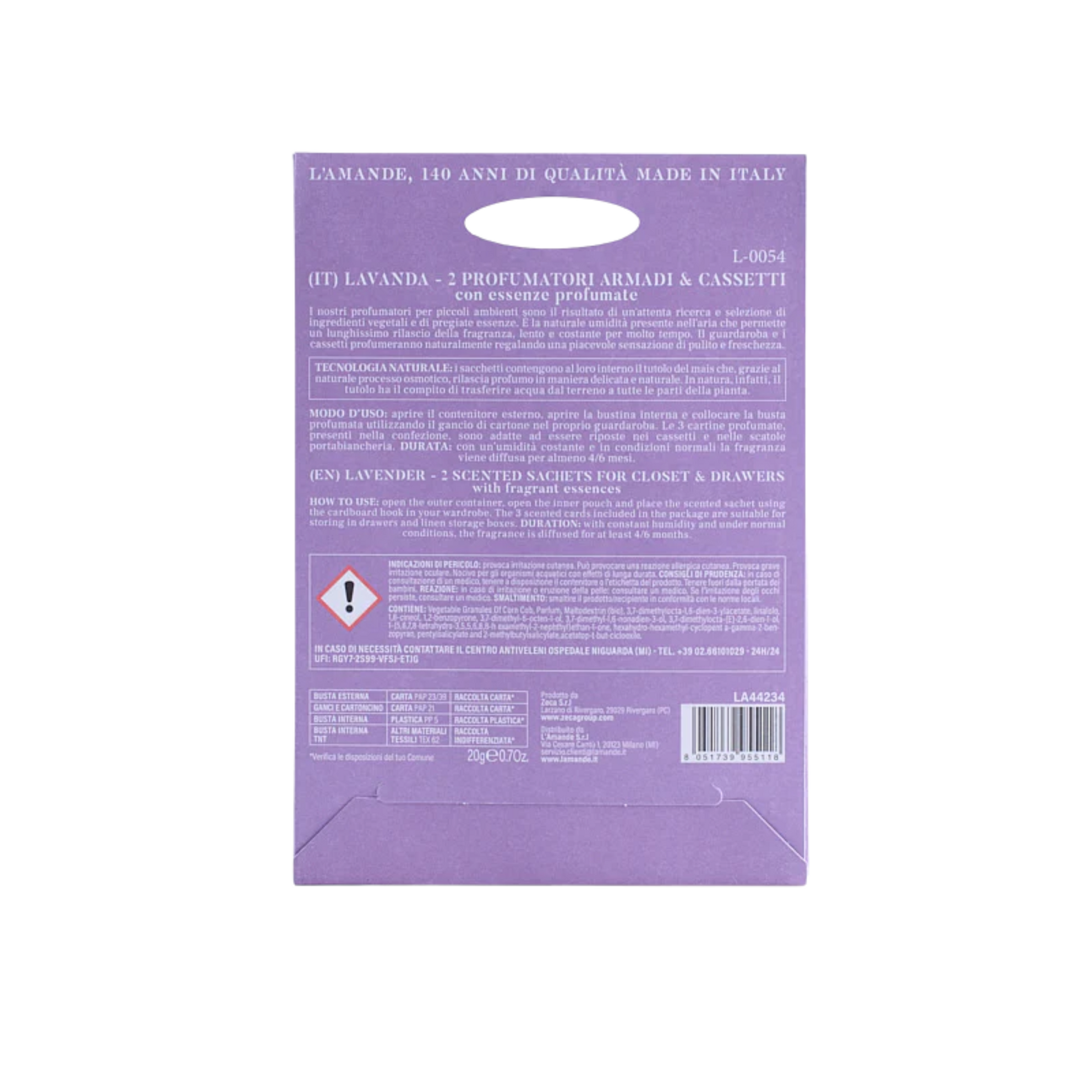 Enjoy the soothing scent of lavender with these delightful sachets. These fresheners can be used in your closets, wardrobes, drawers or small spaces to create a clean and fresh aroma. L'amande has crafted these sachets with careful research to select the finest plant ingredients and essences. This unique form of home fragrance uses the natural humidity in the air to create such a long and sustained release of fragrance.