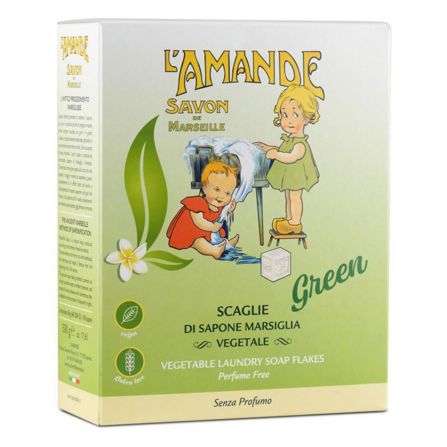 L'Amande soap flakes are made of 100% Marseille soap, still produced according to the original recipe of the ancient “Huilerie & Savonnerie de L'Amande” of Marseille. They do not contain dyes or perfume. 100% biodegradable, they respect the seas and rivers. They respect the most delicate garments and colors, so they are recommended for all types of washing.