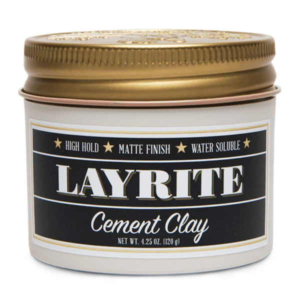 The Layrite Cement Clay is an extreme high hold matte hair clay. This clay never lets hair go out of style. This extreme high-hold, water-based styling clay locks in shape and texture with a clean, matte finish that lasts all day. It thickens and texturizes hair without weighing it down, offering the strongest hold in the Layrite lineup. Flexible and reworkable, it washes out easily with water, never flakes, and leaves hair looking healthy and styled — not stiff. simply warm between palms and apply lightly to control frizz, add separation, and define texture. Layer on damp hair for a more natural hold or dry hair for maximum strength. Lightly scented with Layrite’s signature mild cream soda fragrance.