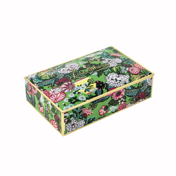 This decadent tin features an artistic and bold Chinese Dragon on a bold jade green background. For over 130 years, Schumacher has been synonymous with style, taste and innovation. And the Chiang Mai Dragon pattern, inspired by an Art Deco print, is one of the family-owned design house’s best-loved designs.