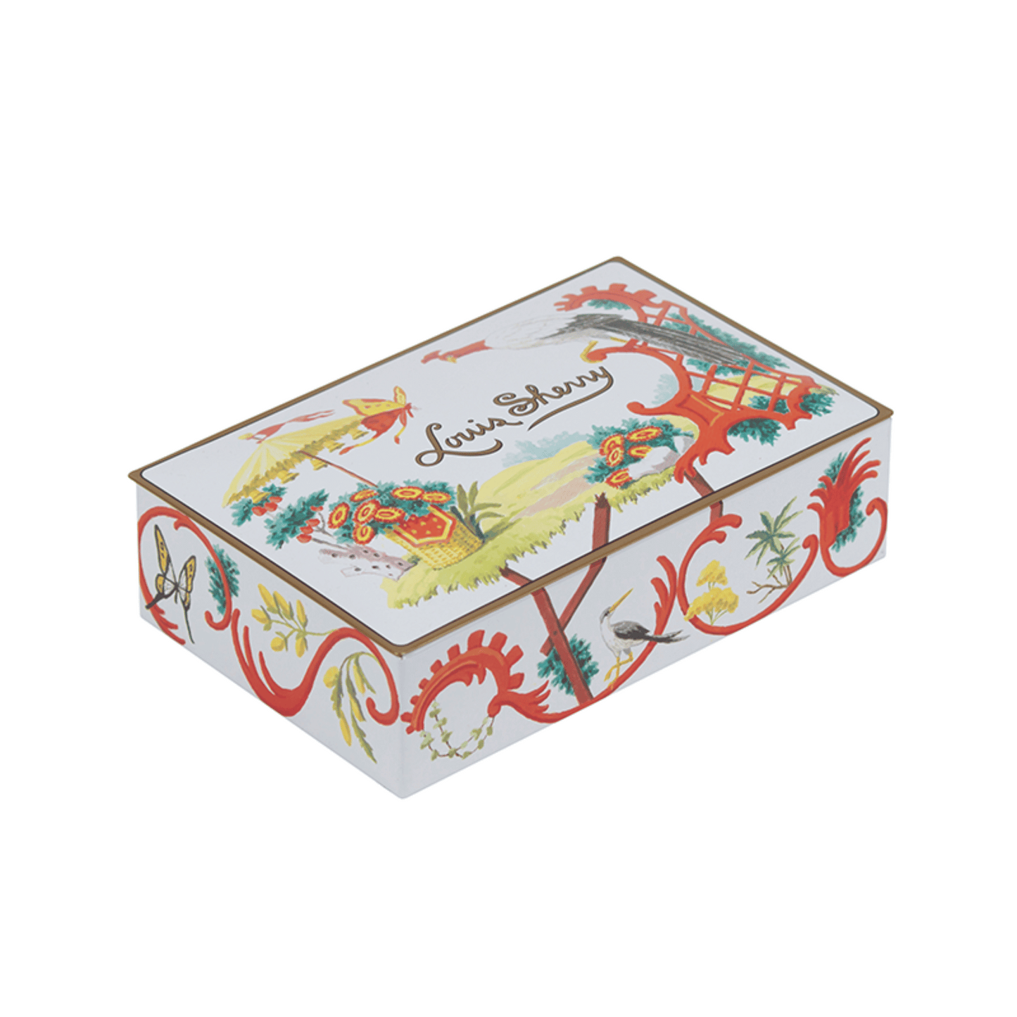 This decadent tin features an elegant and striking design from Harrison Howard. Harrison Howard was born in 1954 in Bryn Mawr, Pennsylvania. Much of his professional career has been devoted to mural work in private homes, and has included screen prints, panels, easel paintings and watercolors. In the most recent years his focus has been on easel painting and limited edition prints, often with bird, animal or floral motifs.