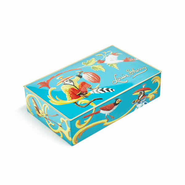 This decadent tin features an elegant and striking design from Harrison Howard. Harrison Howard was born in 1954 in Bryn Mawr, Pennsylvania. Much of his professional career has been devoted to mural work in private homes, and has included screen prints, panels, easel paintings and watercolors. In the most recent years his focus has been on easel painting and limited edition prints, often with bird, animal or floral motifs.