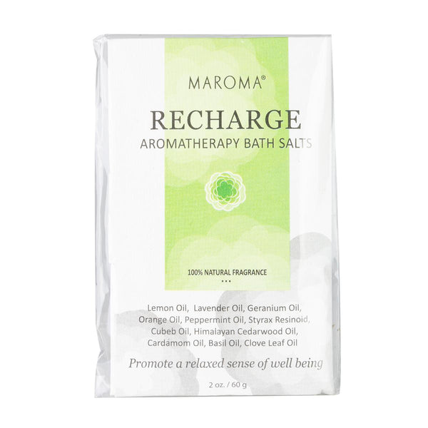 100% natural Maroma Aromatherapy Bath Salts are a pure blending of natural goodness containing only mineral-rich salts and essential botanic extracts. Free of unnecessary additives such as artificial fragrance, preservatives, and color, these baths salts provide a soothing, nurturing, and luxurious bathing experience.Recharge contains a blend of lemon, lavender, geranium, orange, peppermint, cubeb, Himalayan cedarwood, cardamom, basil, and clove leaf oils with styrax resinoid.