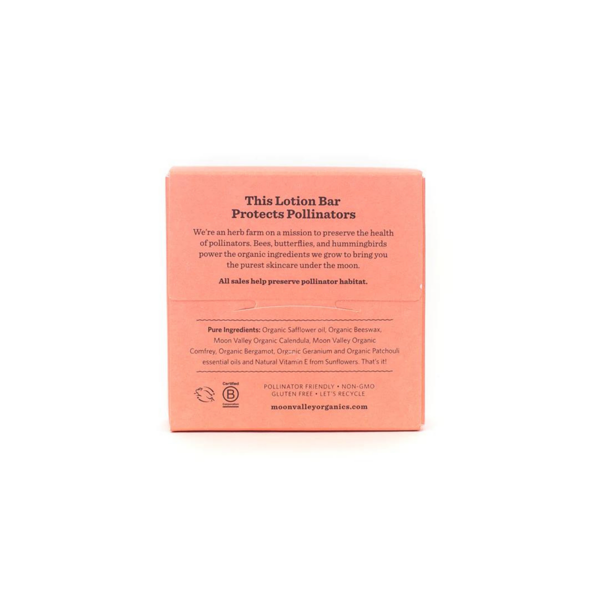 Organic Safflower oil, Organic Beeswax, Moon Valley Organic Calendula and Organic Comfrey, Organic Bergamot, Organic Geranium, Organic Patchouli essential oils, and natural Vitamin E from Sunflowers.