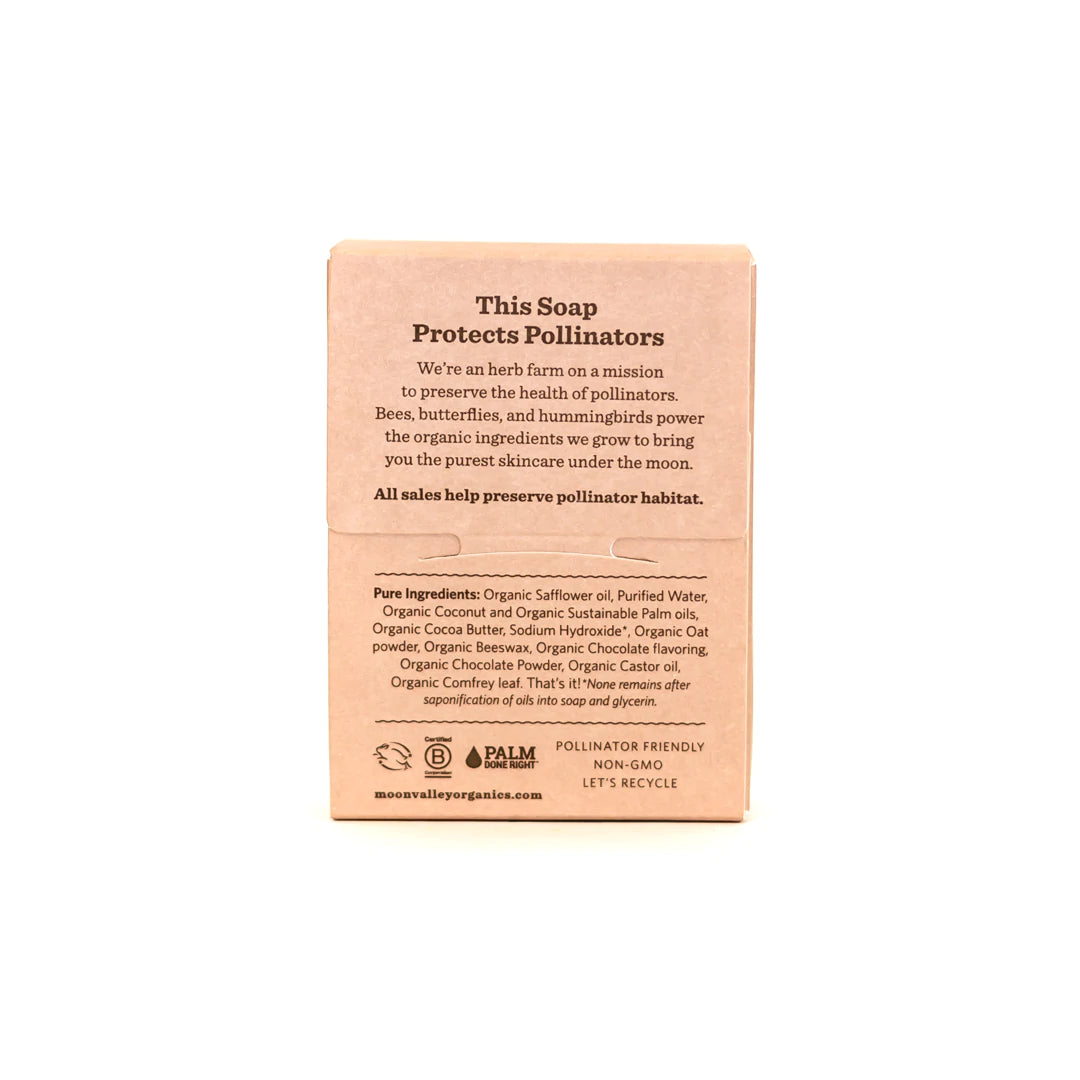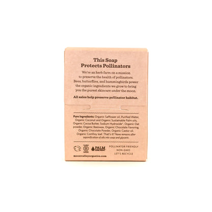 Organic Safflower, Purified Water, Organic Coconut and Organic Sustainable Palm oils, Organic Cocoa Butter, Sodium Hydroxide*, Organic Oat powder, Organic Beeswax, Organic Chocolate flavoring, Organic Chocolate Powder, Organic Castor oil, and Organic Comfrey leaf.