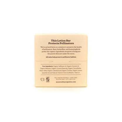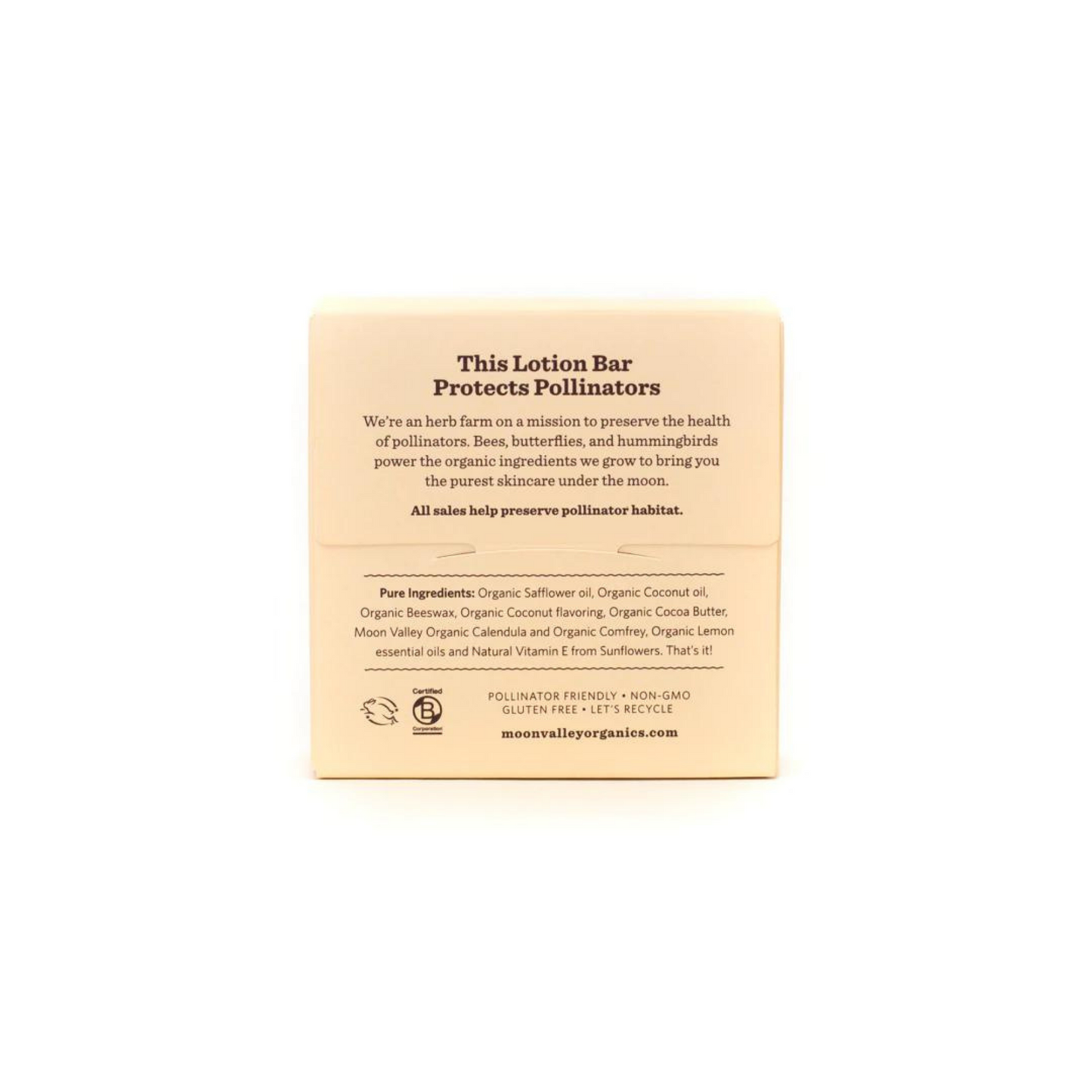 Organic Safflower oil, Organic Coconut Oil, Organic Beeswax, Organic Coconut flavoring, Organic Cocoa Butter, Moon Valley Organic Calendula and Comfrey, Organic Lemon essential oils and Natural Vitamin E from Sunflowers.