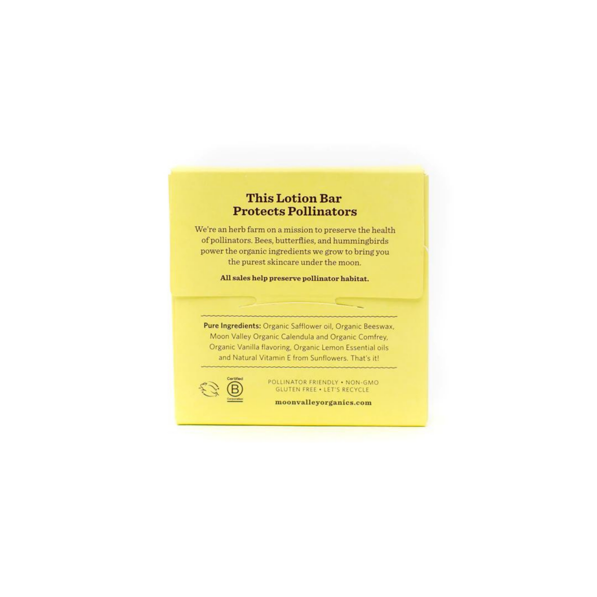 Organic Safflower oil, Organic Beeswax, Moon Valley Organic Calendula and Comfrey, Organic Vanilla flavoring, Organic Lemon essential oils and Natural Vitamin E from Sunflowers.